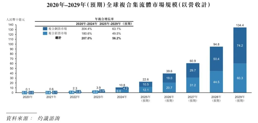 2020年至2024年,全球复合集流体市场增长迅速,市场规模由人民币1亿元增至人民币108亿元,年复合增长率达到207.0%。未来五年,复合集流体将继续快速起量,预期到2029年,全球复合集流体整体市场规模将达到人民币1,344亿元,2025年至2029年的年复合增长率为56.2%。