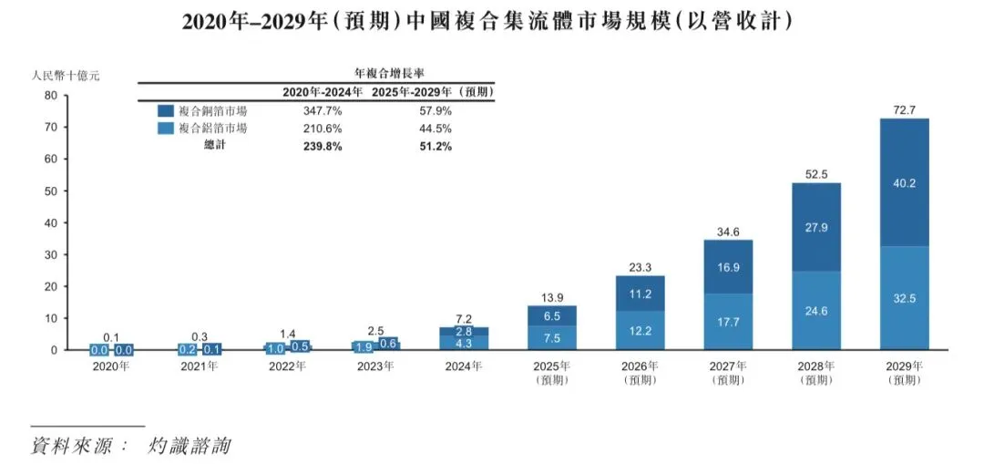2020年至2024年,中国复合集流体的市场规模由人民币1亿元增至人民币72亿元,年复合增长率达到239.8%。预期到2029年,中国复合集流体整体市场规模将达到人民币727亿元,2025年至2029年的年复合增长率为51.2%。