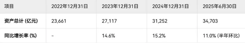 资产规模与结构方面,宁波银行总资产从2022年末的2.37万亿元增长至2024年末的3.13万亿元,两年增幅达32.1%,复合年增长率约15.0%,显著高于银行业平均增速。截至2025年6月末,总资产进一步升至3.47万亿元,半年增幅11.0%,增速强劲,反映出银行在宏观经济波动中仍坚持扩张策略。