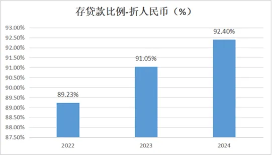 宁波银行2022年至2024年存贷款比例(折人民币)持续攀升,表明该行将存款资源转化为贷款资产的能力不断增强,直接推动了其利息收入的增长和盈利能力的提升。然而,该指标已显著高于75%的法定监管要求,意味着银行的流动性压力随之加大。