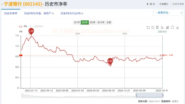 宁波银行作为优质的城商行,其历史PB通常高于行业平均,常在1倍以上。当前市场给予其约0.79倍的PB,反映了对银行板块的悲观预期。
