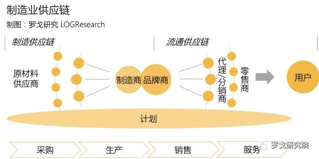 整体来看,我们可以将制造业供应链分为“制造”和“流通”两个环节,简单来说,流通供应链负责将产品卖给目标客户,制造供应链则是组织资源将产品及时准确地生产出来,保障流通。而制造供应链和流通供应链共同组成以核心企业(品牌商/制造商等)为主导的,为最终用户提供产品与服务的制造业供应链。