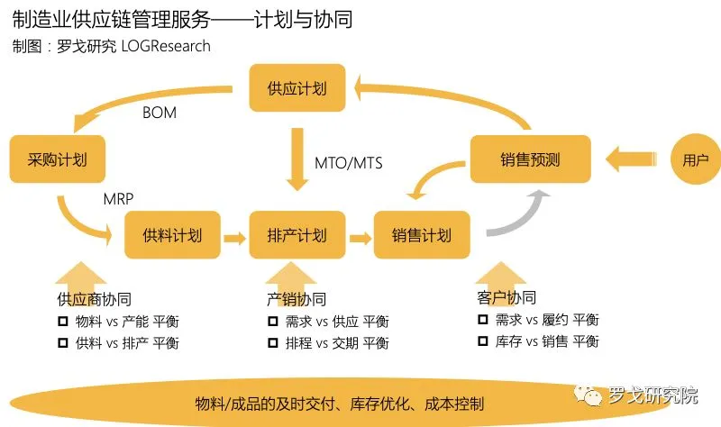 计划由销售预测驱动,在制造端以物料供应为主导,在流通端以产品(订单)供应为主导。从供应链管理服务的视角,深刻理解核心企业的供应链结构、产品与服务、采购制造流程、渠道与销售模式,是提供有效服务的基础,进而通过供应链协同平台,协同上下游(供应商协同、产销协同、客户协同),实现物料/产成品的及时交付、库存优化、成本控制。