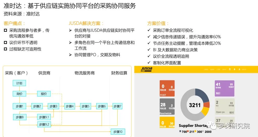 准时达通过JUSDA供应链实施协同平台,串联客户供应链端到端各环节,协同上下游资源,实现全链条的可视化与智能管控。