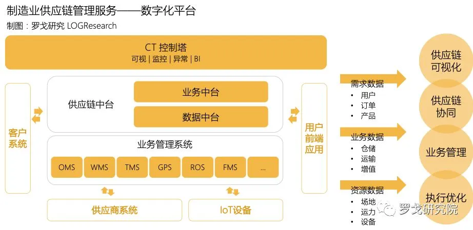 基于中台架构,对接内外部业务系统、智能设备,以业务中台驱动业务统一管理,以数据中台驱动匹配业务的标准化数据语言,并在此基础之上,为客户提供基于控制塔的供应链整体可视化服务。
