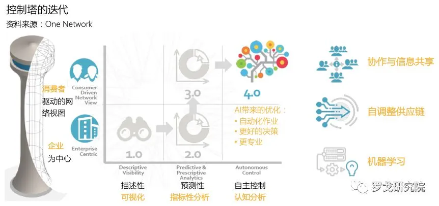 控制塔为大型品牌/制造商提供了复杂业务下的全局管控工具,伴随技术的发展,One Network 认为,控制塔逐步从以企业为中心,过渡到以消费者为驱动的网络视图,实现供应链网络结构下的参与者协作与信息共享;从供应链可视化,到基于大数据与人工智能的自主认知分析与控制,驱动供应链的自动动态调整与优化。