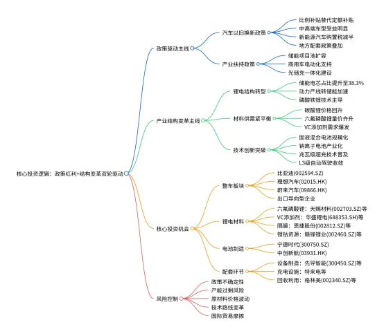 8.仓位配置:整车板块30-40%(聚焦中高端与出口导向型企业)、锂电材料板块30-40%(重点布局六氟磷酸锂、VC添加剂、隔膜等供需紧平衡品种)、电池制造板块20-30%(把握龙头企业技术与规模优势)、充电设施及回收利用板块10%(布局细分赛道机遇);9.建仓时点:春节后2-3月(政策效应集中释放,销量数据有望超预期,催化板块行情)、年中6-7月(半年报业绩披露期,关注企业盈利表现,业绩超预期标的具备估值修复空间)、年底11-12月(为2027年布局的窗口期,把握估值切换机会);10.核心逻辑:把握“政策精准扶持+储能需求爆发+技术迭代升级”三大主线,聚焦供需紧平衡环节与具备全球竞争力的龙头企业,兼顾成长性与估值合理性,动态调整投资组合。四、投资逻辑思维导图