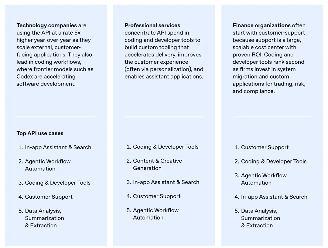 不同行业的 API 应用场景也各具特色:科技企业聚焦面向客户的应用与编码工具;专业服务行业侧重定制化工具开发与客户体验个性化;金融行业则从客服场景切入,逐步向交易、风控等核心业务延伸。四、警惕!企业 AI 的 “马太效应”:领跑者与落后者差距悬殊