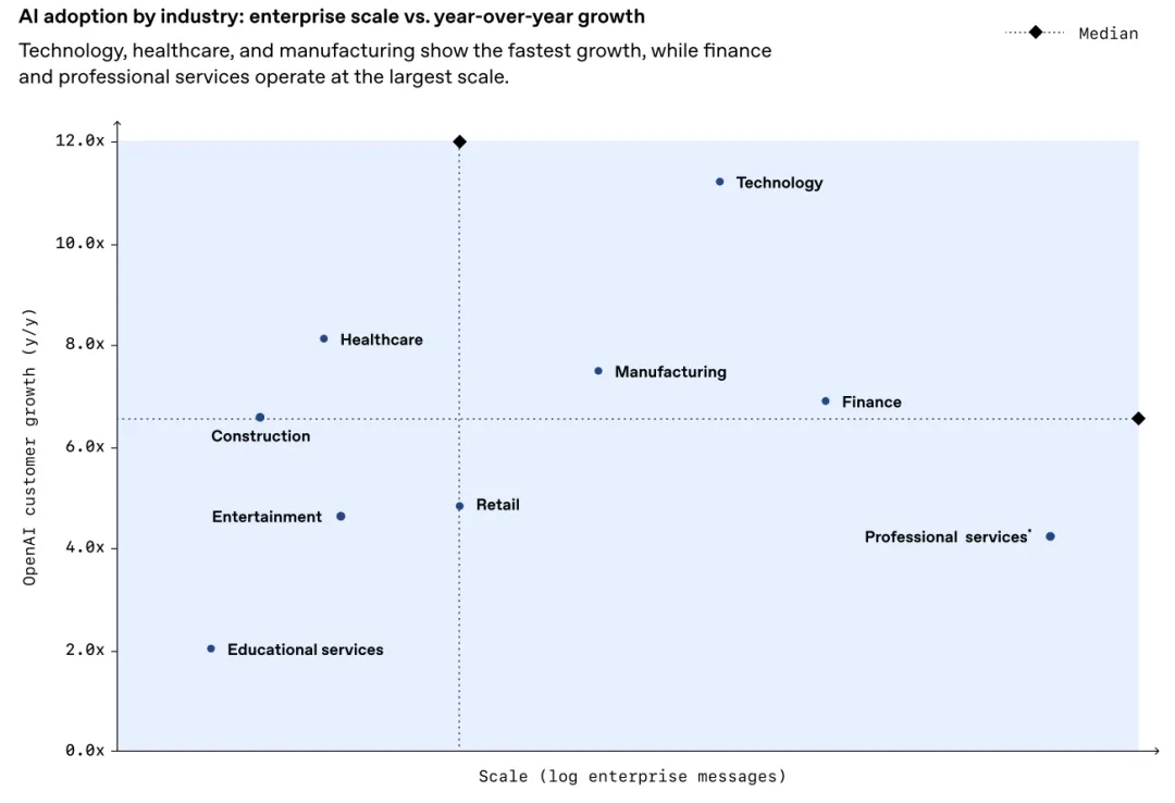 - 规模领先者:专业服务、金融、科技行业的 AI 应用规模最大,作为早期布局者,其使用深度仍保持领先。