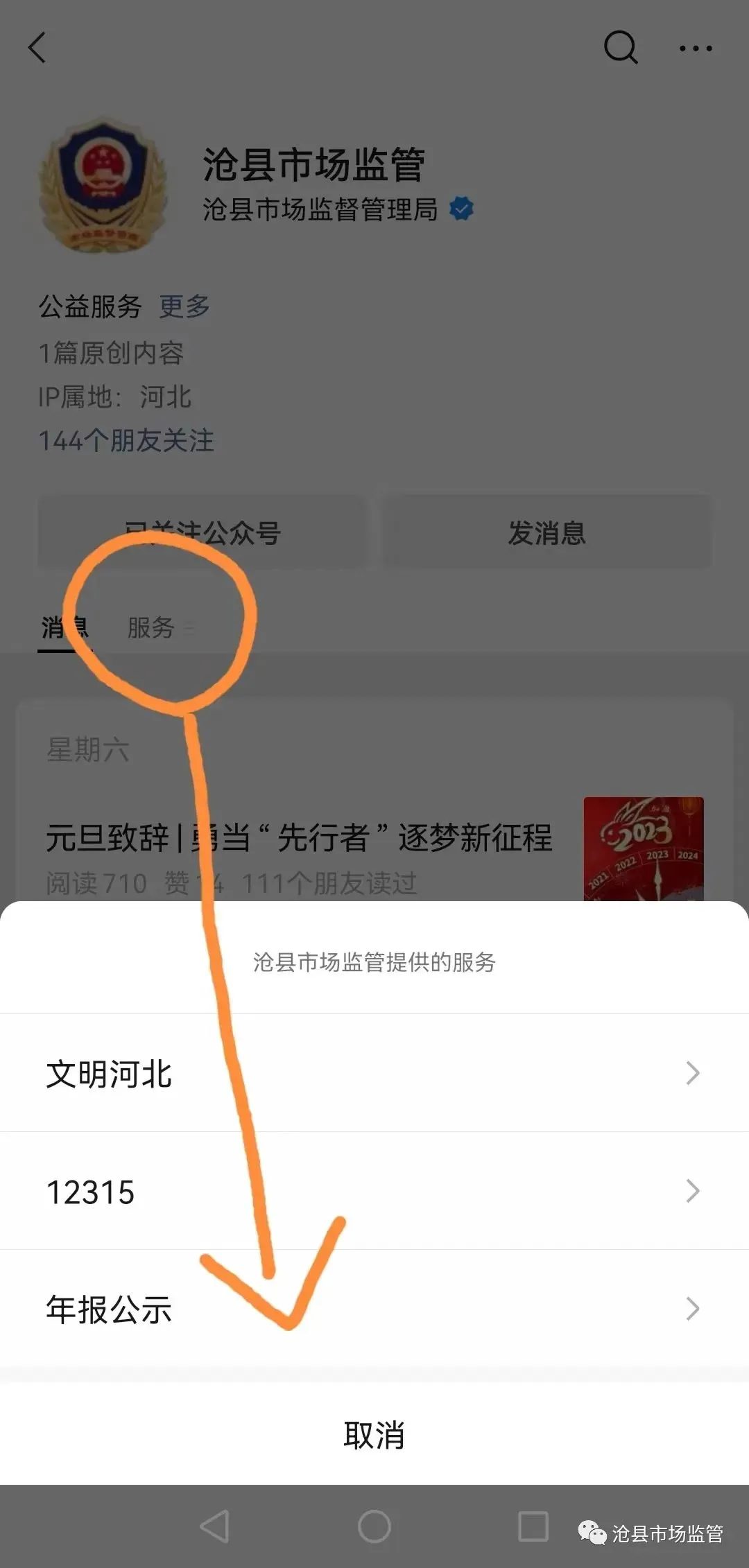 或者在已关注的“沧县市场监管”微信公众号中,选择“服务”——【年报公示】。