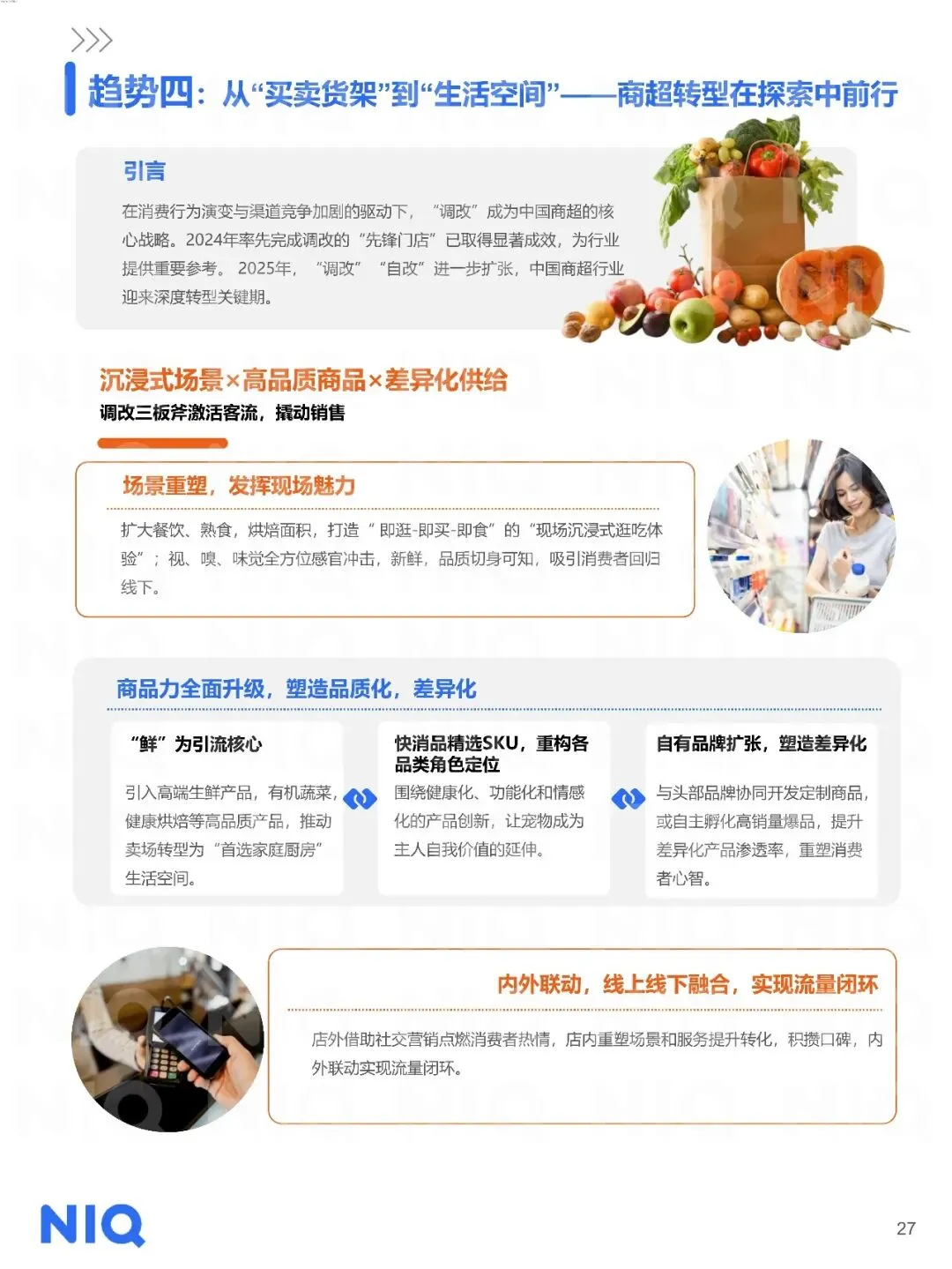 快消品全渠道增速波动,线上企稳,线下转型,耐消品增长依赖国家补贴,科技耐用消费品零售业变革加速。消费者对个人财务持谨慎乐观态度,消费行为更加务实,注重产品安全、健康化和便捷化。不同代际消费特征明显,婴儿潮一代追求新事物,X世代务实极简,千禧一代注重体验,Z世代追求圈层认同。零售渠道变革中,大型商超向生活空间转型,即时零售成为“随叫随到的密友”,内容电商从带货转向共情陪伴。