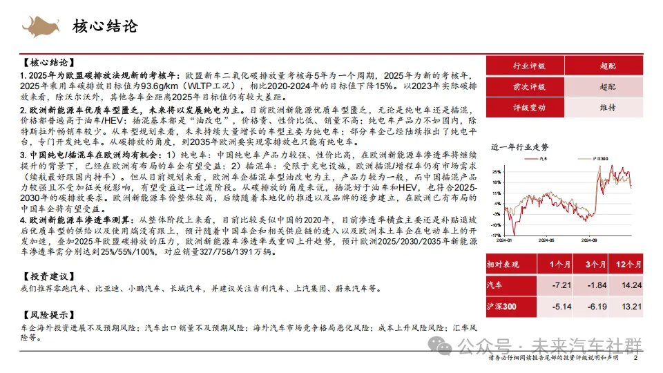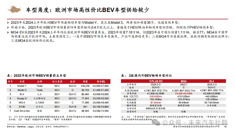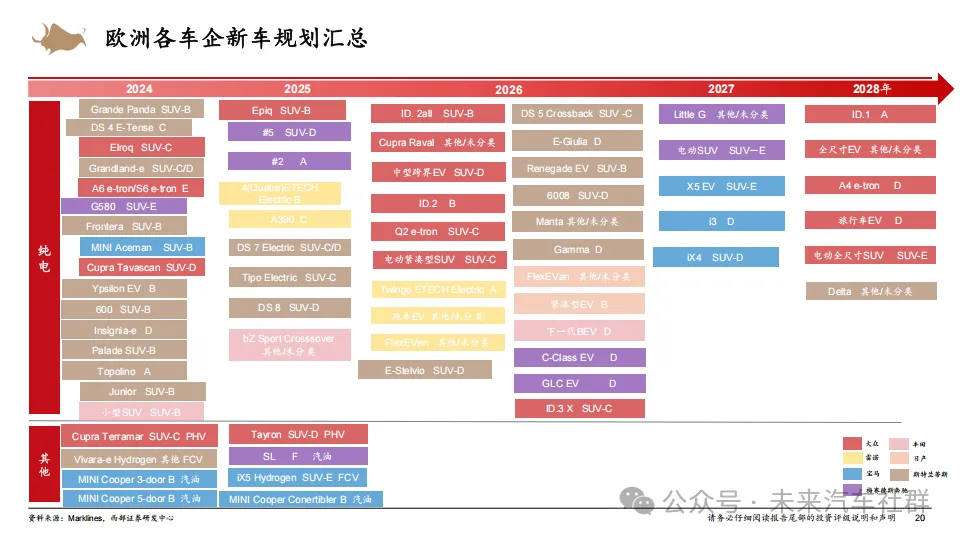 欧洲新能源车优质车型匮乏,未来将以发展纯电为主。目前欧洲新能源优质车型匮乏,无论是纯电车还是插混,价格都普遍高于油车/HEV;插混基本都是“油改电”,价格贵、性价比低、销量不高;纯电车产品力不如国内,除特斯拉外畅销车较少。从车型规划来看,未来持续大量增长的车型主要为纯电车;部分车企已经陆续推出了纯电平台,专门开发纯电车。从碳排放的角度,到2035年欧洲要实现零排放也只能有纯电车。