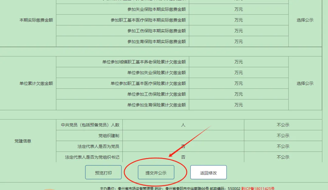 第六步:检查并公示,检查无误后,点击“提交并公示”按钮进行公示,如存在填写错误,则点击“返回”进行修改后再公示