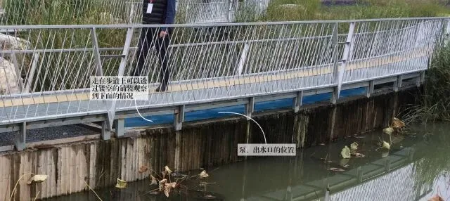 按动说明板上的灯开关,可以在晚间通过旁边的展示井看到水质净化情况;