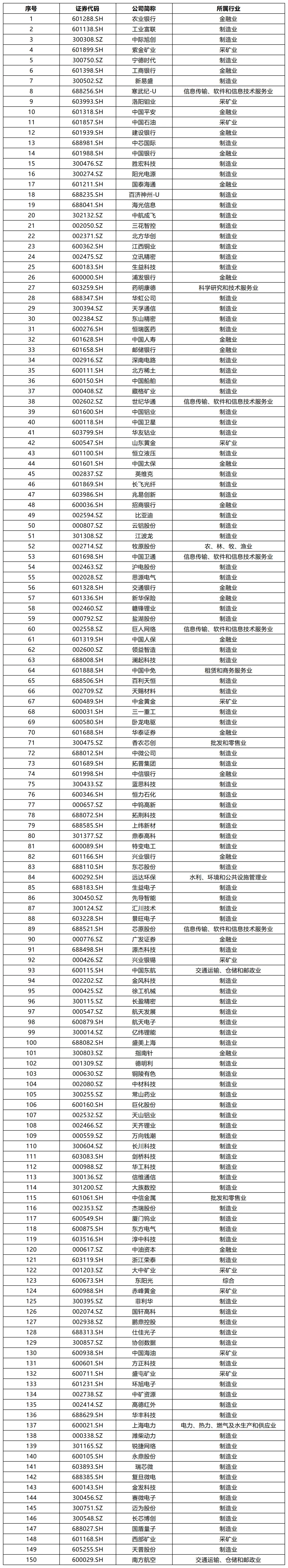 表1 2025年上市公司A股市值增长最突出的150家上市公司