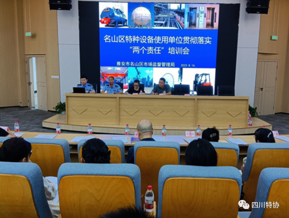 c8月16日-17日,名山区市场监管局分别在成雅工业园区管委会和新店镇人民政府组织辖区内近150家特种设备使用单位召开特种设备使用单位贯彻落实“两个责任”培训会,区经信局、成雅工业园区管委会、12个镇(街道)相关负责人参加会议。