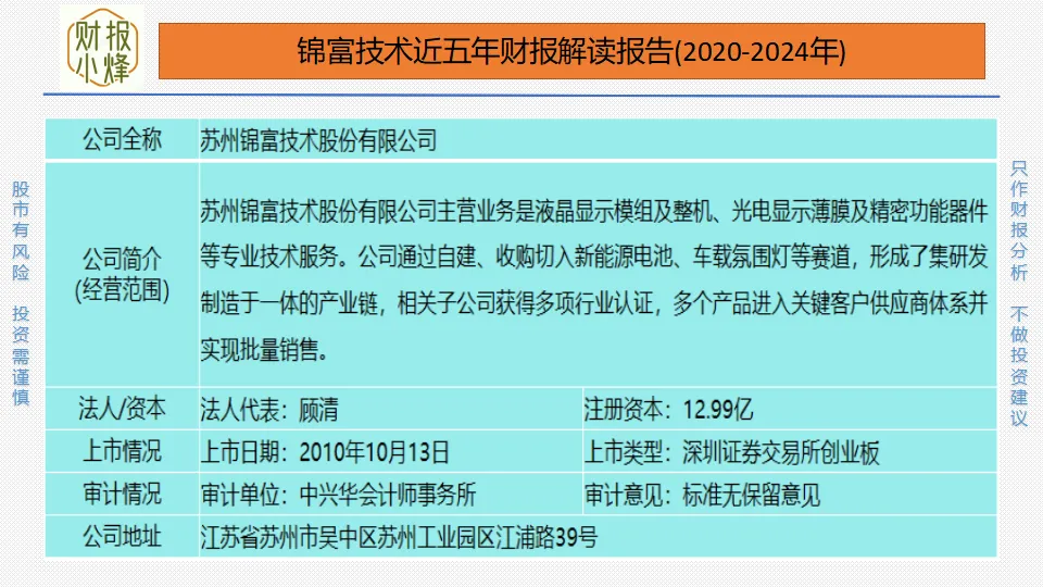 通过上图,我们对锦富技术是做什么的、从事什么行业以及做得怎么样有了大概了解。但这些还不够,想要进一步了解该公司,还需要对其财报进行深入分析。财报小烽只分析审计意见为“标准无保留意见”的上市公司,因为该公司的财报真实性和准确性都比较高,朋友们应该远离不是此意见报告的公司。