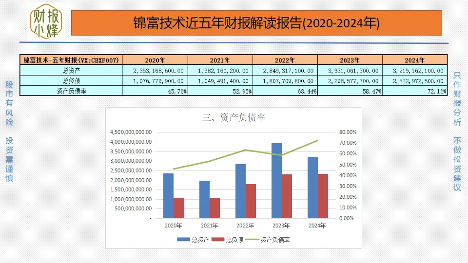 2020年至2024年,锦富技术的总资产分别为23.53亿元、19.82亿元、28.49亿元、39.31亿元、32.19亿元,总负债分别为10.77亿元、10.49亿元、18.08亿元、22.99亿元、23.23亿元,资产负债率分别为45.76%、52.95%、63.44%、58.47%、72.16%。资产负债率逐年上升,2024年超过70%,偿债风险较高,财务结构承压,需警惕债务负担。