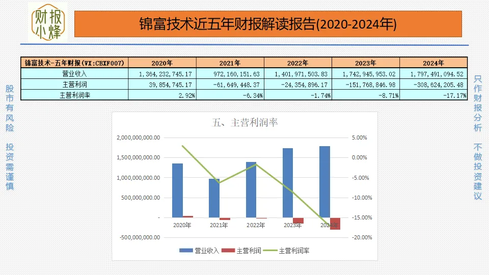 2020年至2024年,锦富技术的主营利润分别为0.40亿元、-0.62亿元、-0.24亿元、-1.52亿元、-3.09亿元,主营利润率分别为2.92%、-6.34%、-1.74%、-8.71%、-17.17%。主营利润率一直低于15%,核心业务盈利能力弱,利润质量差,难以持续。