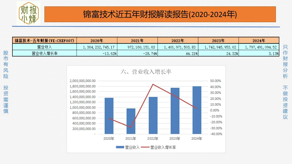 2020年至2024年,锦富技术的营业收入分别为13.64亿元、9.72亿元、14.02亿元、17.43亿元、17.97亿元,营业收入增长率分别为-13.62%、-28.74%、44.21%、24.32%、3.13%。增长率波动剧烈,行业地位不稳,成长性欠佳。