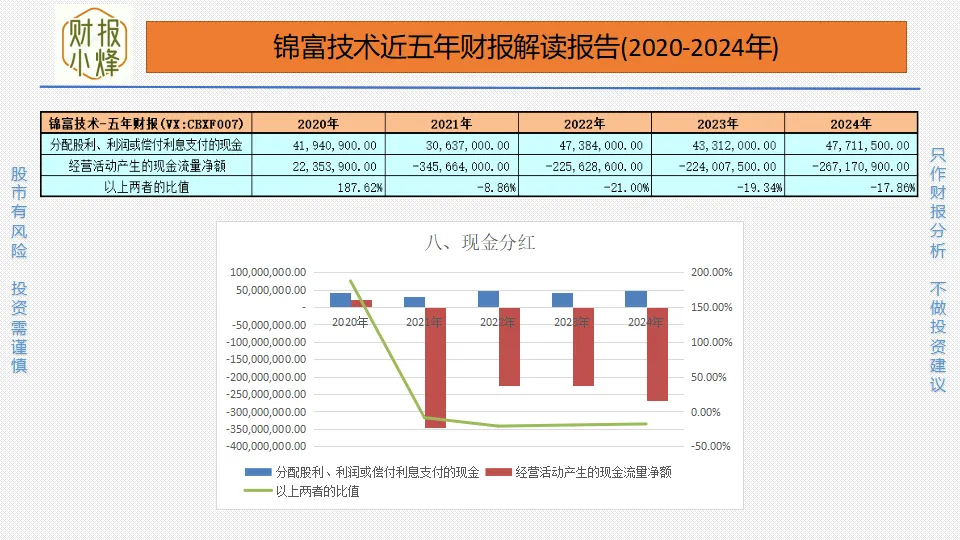 2020年至2024年,锦富技术的现金分红金额分别为0.42亿元、0.31亿元、0.47亿元、0.43亿元、0.48亿元,现金分红率平均值24.11%。分红率低于20%,股东回报一般,分红慷慨度不足。