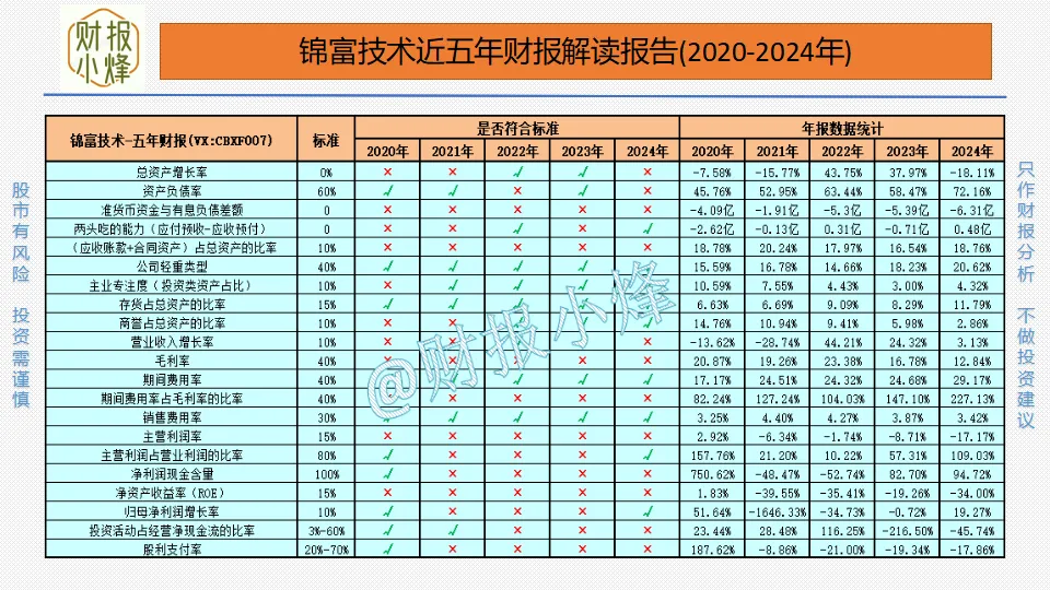 以上是八个关键财务指标的分析,只能判断大概方向,想要对锦富技术进行深层次的了解,我们还应该整体分析21个财务指标,这里为了给大家节约时间,小烽特将锦富技术的21个财务指标整体情况做了两张图表提供给大家。