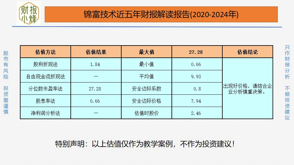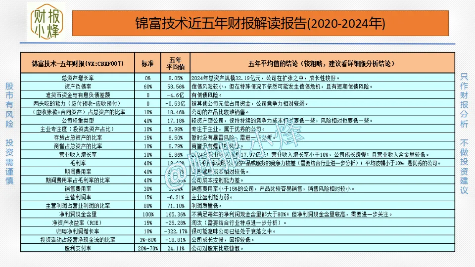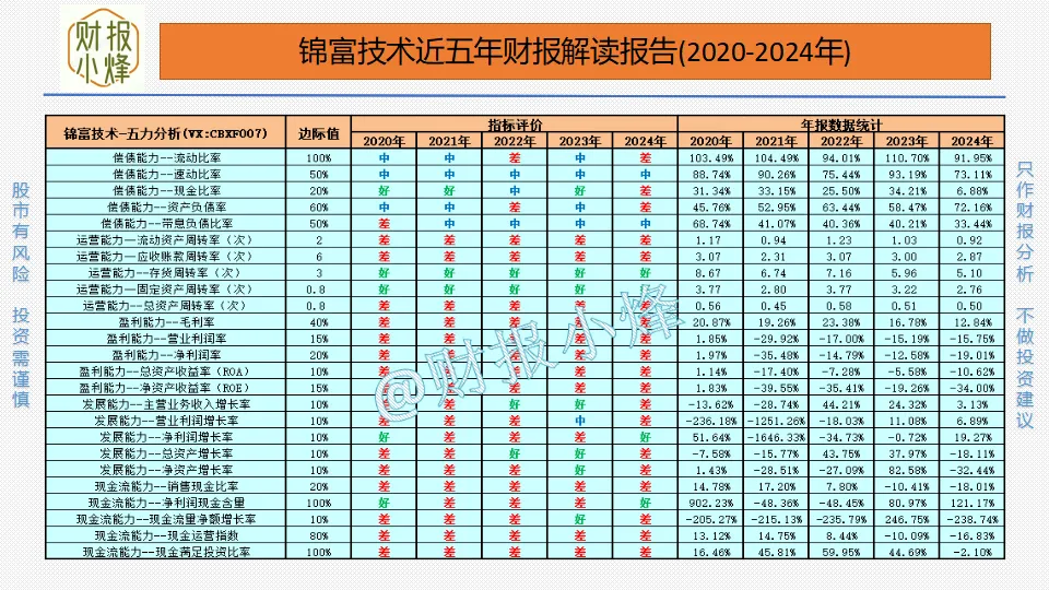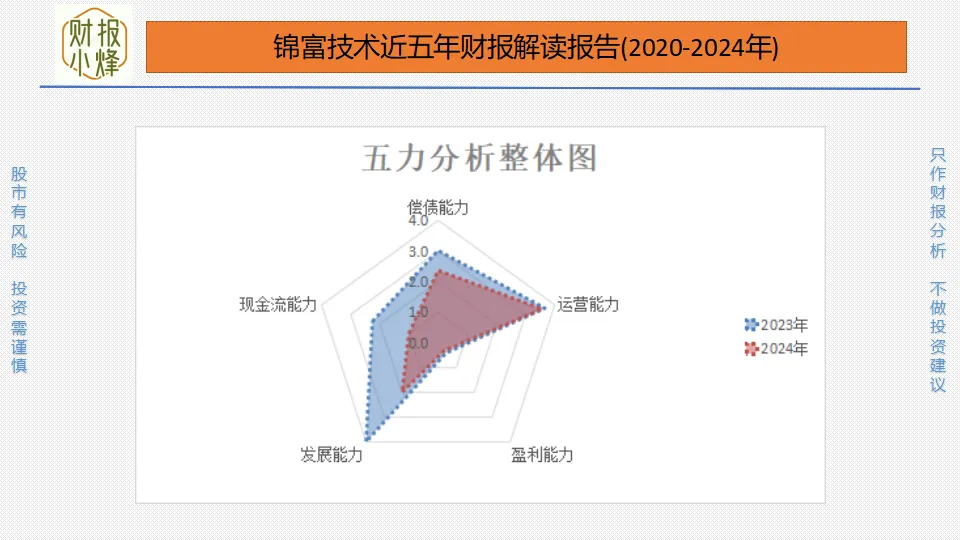 锦富技术的偿债能力与去年同期相比略有下降,由中等水平下降至中低水平;运营能力与去年同期相比持平,保持在中等水平;盈利能力与去年同期相比持平,保持在低水平;发展能力与去年同期相比明显下降,由中高水平下降至中低水平;现金流能力与去年同期相比明显下降,由中低水平下降至低水平;整体来看“五力”明显下降。