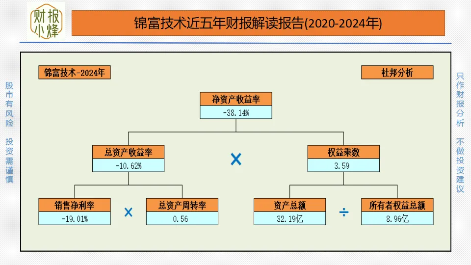 锦富技术2024年的销售净利率为-19.01%,说明公司的销售净利率非常低,公司的产品不好,盈利能力非常弱,属于低销售净利率的公司;锦富技术2024年的总资产周转率为0.56,说明公司的管理效率较低,资金运营的效率也较低,属于低总资产周转的公司;锦富技术2024年的权益乘数为3.59,说明公司的财务杠杆较高,负债较高,财务风险也较高,属于高杠杆公司;总之,锦富技术公司属于低销售净利率低资产周转率高杠杆公司。