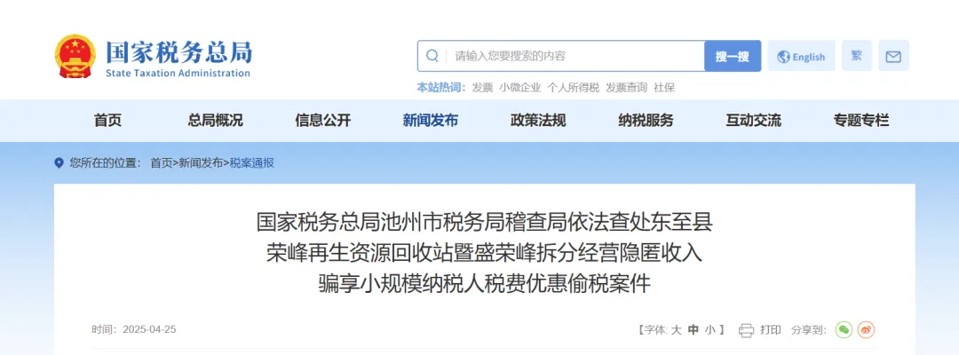 2025年4月25日,国家税务总局公布荣某再生资源回收站暨盛某某拆分经营隐匿收入骗享小规模纳税人税费优惠偷税案件。盛某某所经营的荣某再生资源回收站收购废纸后向某纸业公司销售,为少缴税款,盛某某借用他人身份证设立85家回收站,通过将本该是荣某再生资源回收站的经营收入拆分至85家回收站,违规享受小规模纳税人减免增值税政策,少缴增值税、个人所得税等税费215.84万元。税务机关对荣某再生资源回收站及盛某某追缴税费款、加收滞纳金并处罚款,共计339.74万元,同时对盛某某及85家再生资源回收站涉嫌虚开发票有关线索移送公安机关进一步侦查。