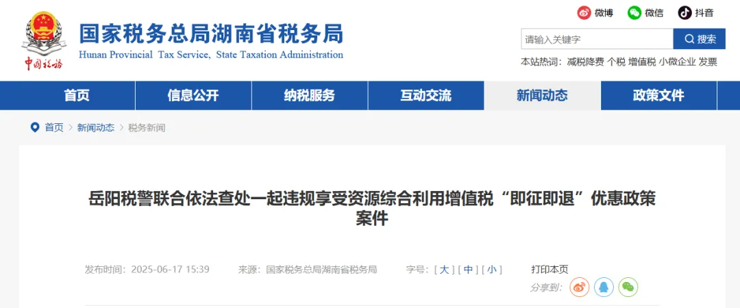 2025年6月,湖南省税务局公开的一则案例显示,某公司利用外购废弃动植物油直接销售和销售不符合原料比例工业级混合油的方式,违规享受资源综合利用增值税即征即退优惠政策。国家税务总局岳阳市税务局稽查局依法追缴该公司违规享受的即征即退税款263.26万元并加收滞纳金,同时依法阻断该企业正在申请的即征即退税款1141.2万元。