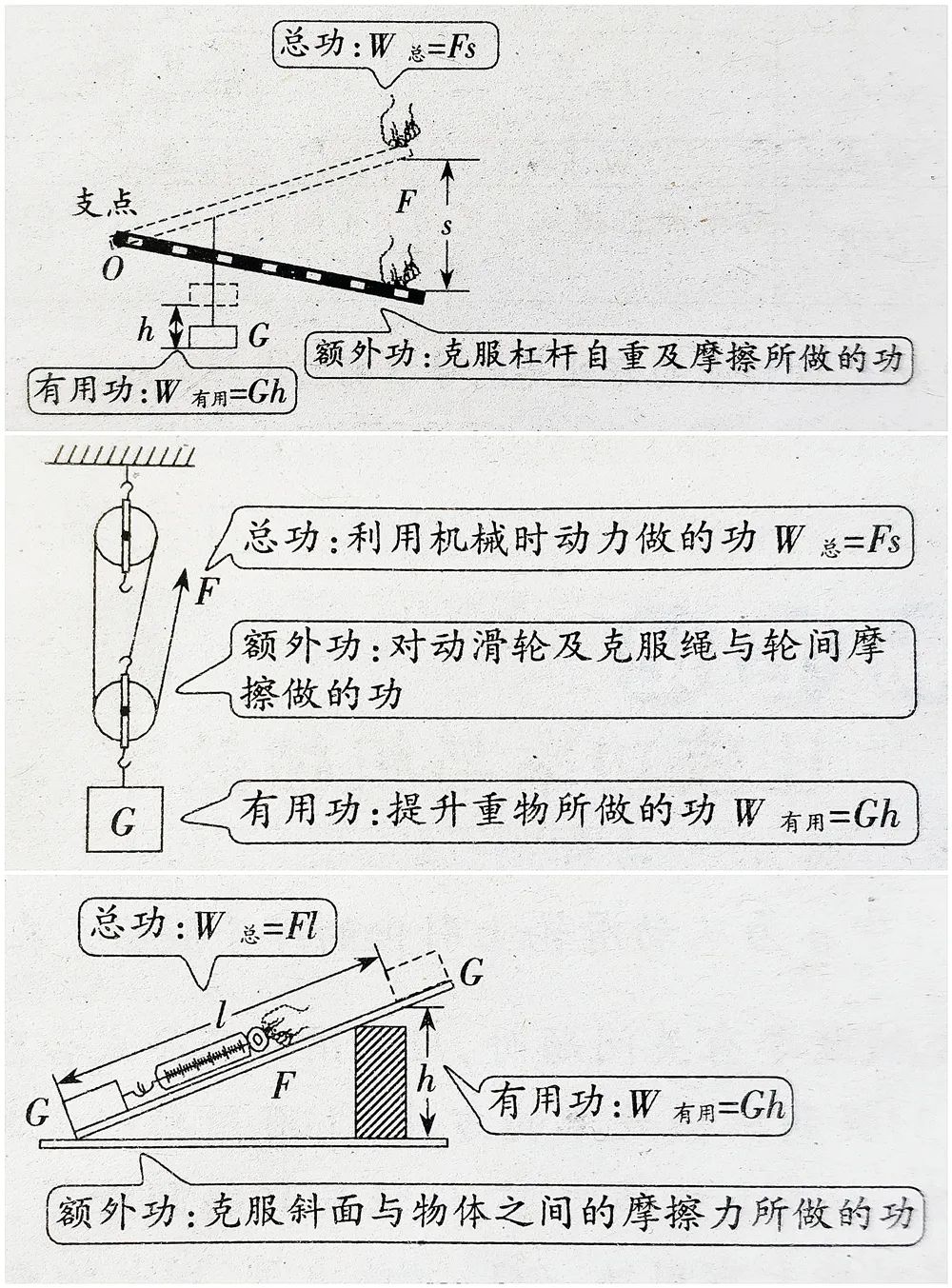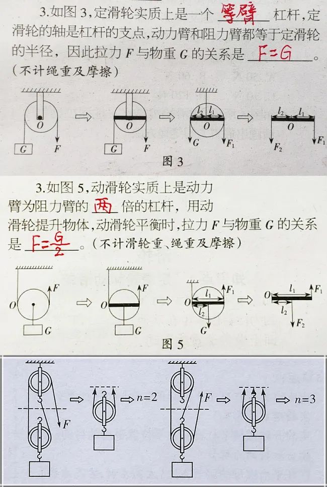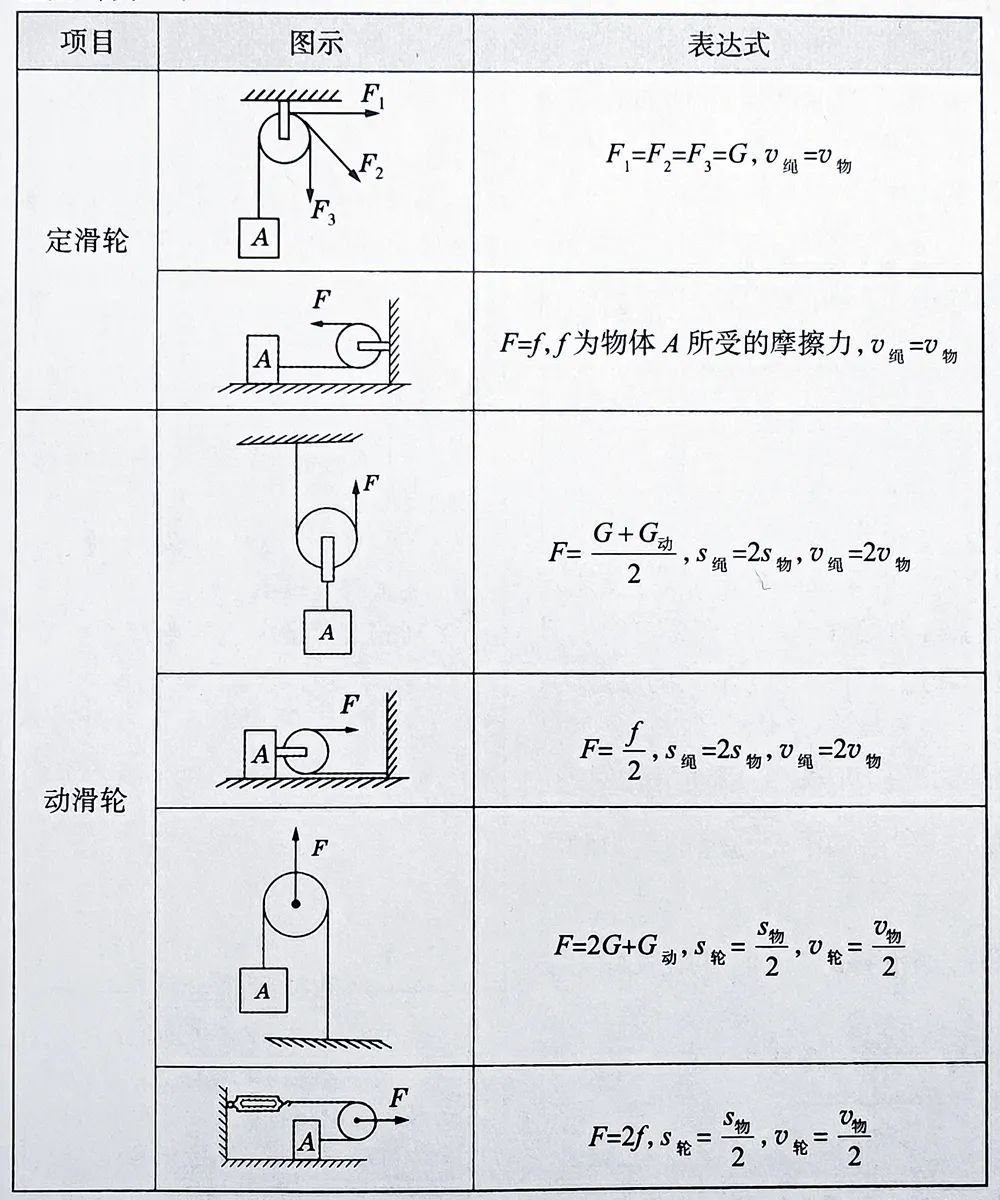 根据上图可以非常好的理解滑轮以及滑轮组的相关基础知识点。二、各种滑轮组中的拉力与物重、绳端距离与物体移动距离、绳端速度与物体移动速度的关系计算问题:三、各种滑轮和滑轮组中的有用功、额外功、总功、机械效率的理解与灵活运用问题:通过以上两种滑轮组的相关习题,可以看出,一定要重视受力分析,在此基础上列出正确的式子。关于斜面的习题,相关题型比较简单,与杠杆和滑轮组相比,斜面的相关中考习题较少,如上图所示,要注意斜面光滑和不光滑两种情况下的区别。了解更多请浏览: