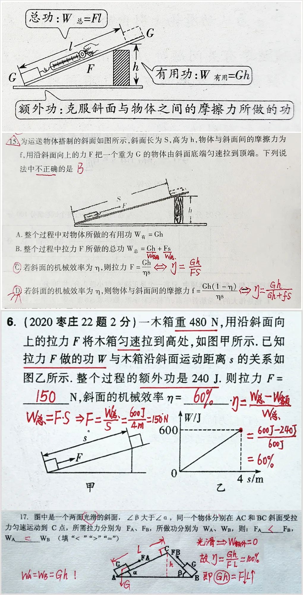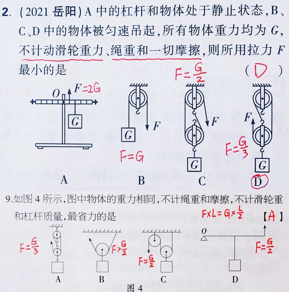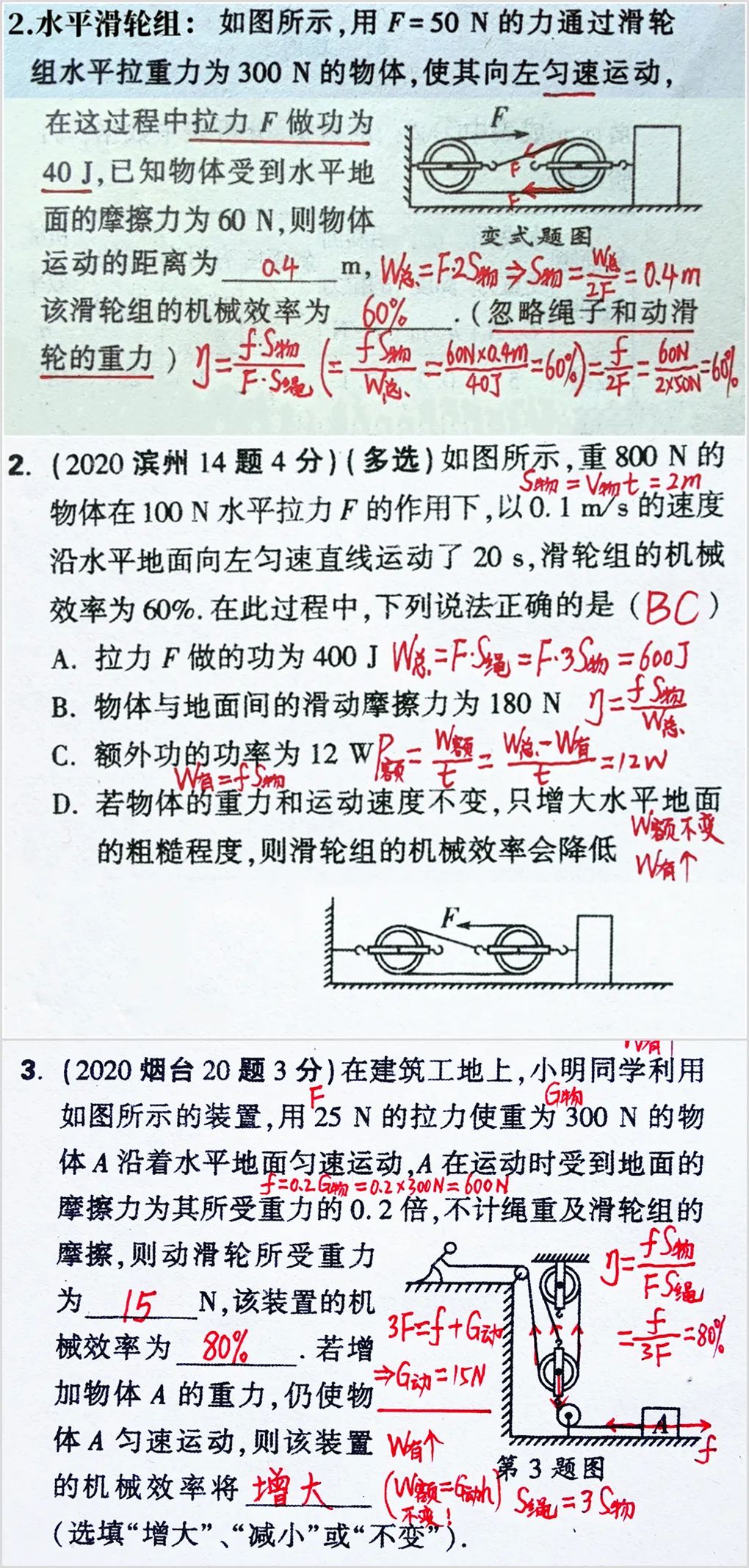 根据上图可以非常好的理解滑轮以及滑轮组的相关基础知识点。二、各种滑轮组中的拉力与物重、绳端距离与物体移动距离、绳端速度与物体移动速度的关系计算问题:三、各种滑轮和滑轮组中的有用功、额外功、总功、机械效率的理解与灵活运用问题:通过以上两种滑轮组的相关习题,可以看出,一定要重视受力分析,在此基础上列出正确的式子。关于斜面的习题,相关题型比较简单,与杠杆和滑轮组相比,斜面的相关中考习题较少,如上图所示,要注意斜面光滑和不光滑两种情况下的区别。了解更多请浏览: