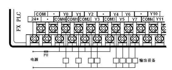 PLC与输出设备连接时,不同组(不同公共端)的输出点,其对应输出设备(负载)的电压类型、等级可以不同,但同组(相同公共端)的输出点,其电压类型和等级应该相同。要根据输出设备电压的类型和等级来决定是否分组连接。如图6所示以FX2N为例说明PLC与输出设备的连接方法。图中接法是输出设备具有相同电源的情况,所以各组的公共端连在一起,否则要分组连接。图中只画出Y0-Y7输出点与输出设备的连接,其它输出点的连接方法相似。