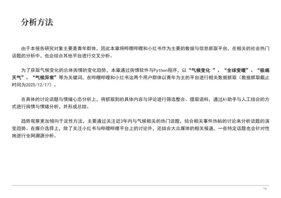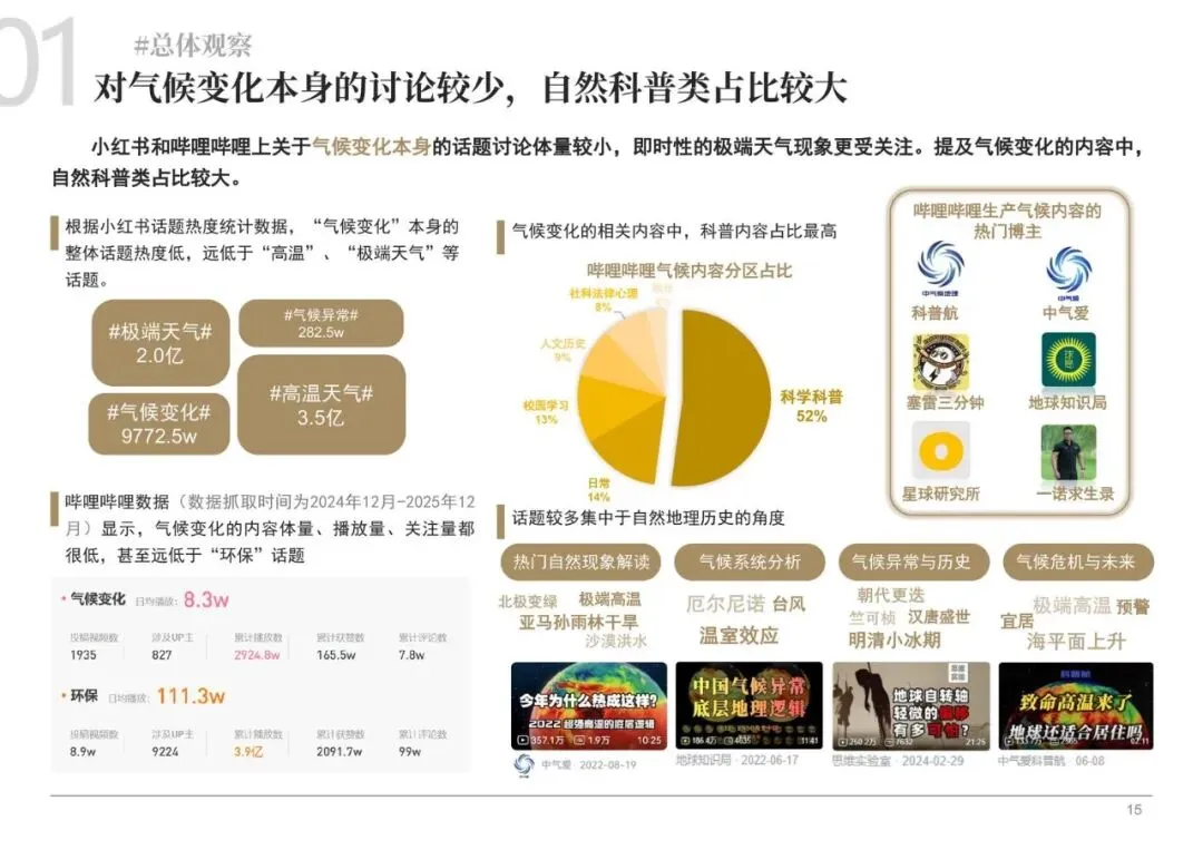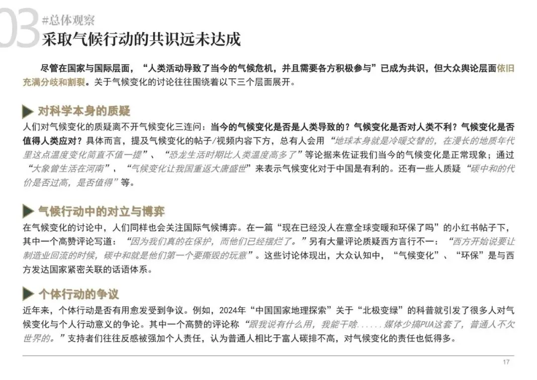 通过对哔哩哔哩、小红书等青年聚集平台的分析,报告发现直接讨论“气候变化”的话题热度远低于“极端天气”、“高温”等具体现象。网络舆论中充斥着对气候变化科学事实的质疑、对国际气候博弈的关注,以及对个体行动意义的激烈争论。“拒绝罪恶平摊论”的流行,反映了部分青年反感将气候责任归咎于普通个体,认为富人应承担主要责任的心态。这种情绪常在与环保倡议相关的评论区爆发,形成一种对抗性话语。