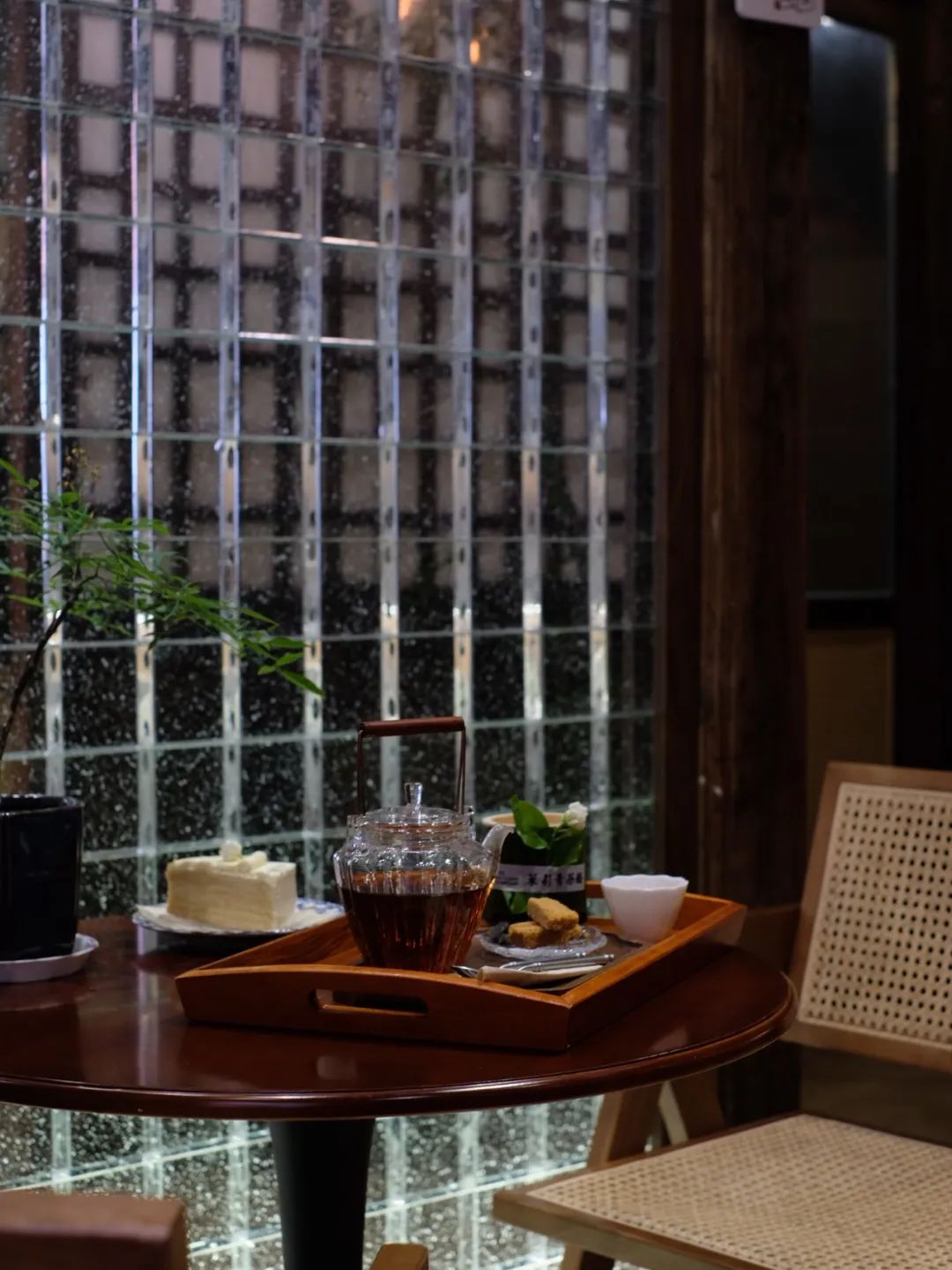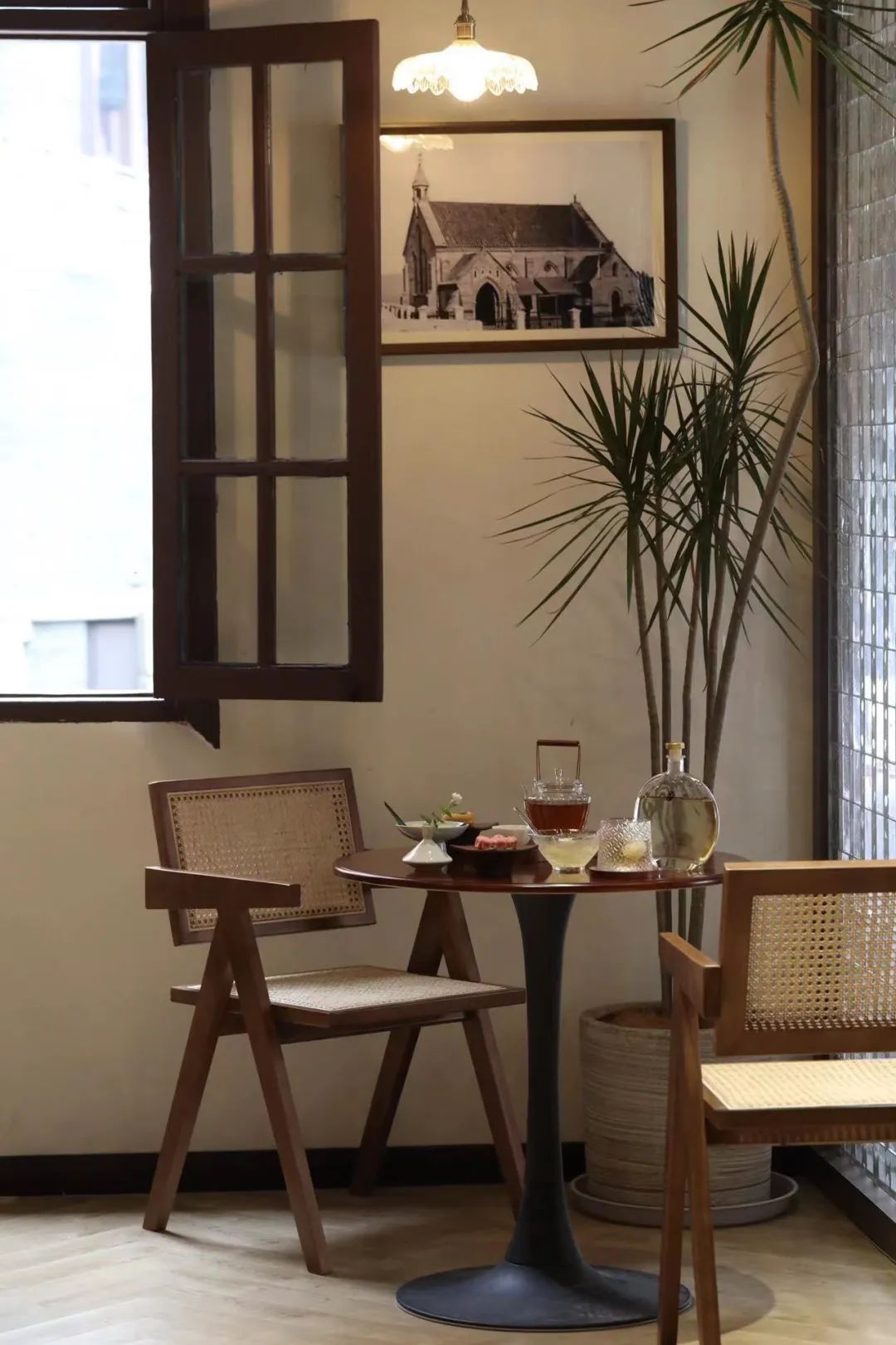 在此基础上,派小姐将一楼传统的窗户设计成一个橱窗,路过的人一眼便能欣赏店内的风景。石竹桌椅颇有竹林隐居的意境;水晶砖和绿植设计的角落让空间更显时尚活力;融入茉莉花茶文化展示及赋有艺术气息的软装设计让空间更具美感。