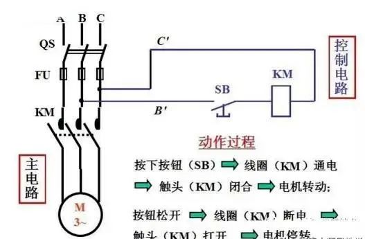 其实在点动电路当中,最关键的就是,是自复式的按钮。当我们按下按钮的时候,电路接通,当我们松开的时候,电路断开。