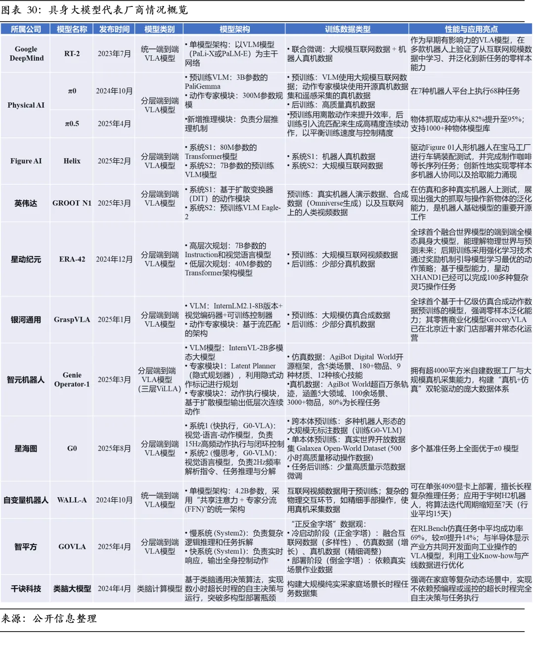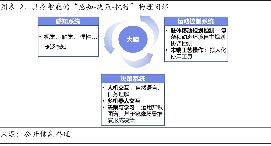 1、具身智能大模型是全新的技术范式,而非大语言模型的延伸。其核心使命在于构建“感知-决策-执行”的物理闭环,使机器人从执行预设代码的工具跃升为能够理解环境并自主完成复杂任务的智能体。因此,它正成为重构产业价值链、定义下一代智能等级的核心锚点。