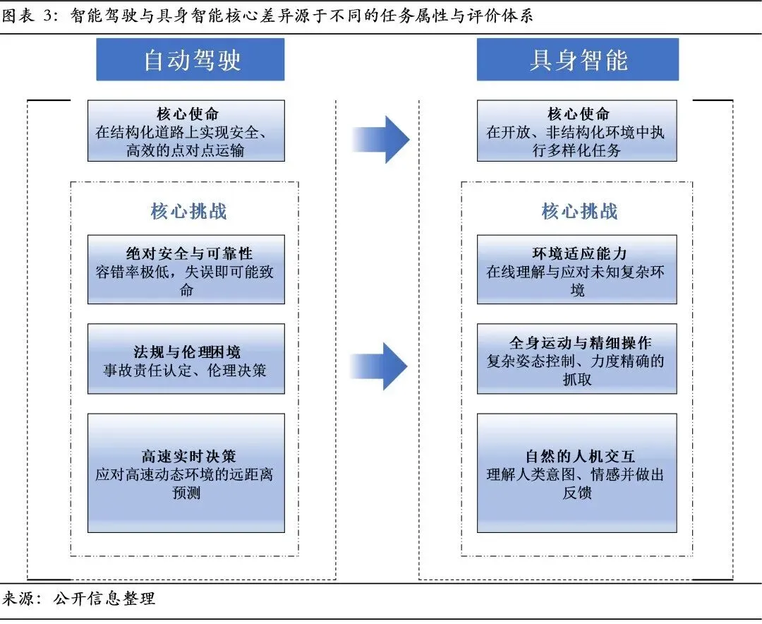 当前市场的一个普遍误解即将ChatGPT、Sora等模型接上摄像头和机械臂就是具身智能机器人。这种观点混淆了两种截然不同的模型范式。以ChatGPT为代表的大语言模型(LLM)是数字世界的基础模型。其智能建立在静态文本的统计关联之上;其核心目标是语言的生成与理解,擅长处理语言、知识与逻辑推理,但完全脱离物理实体;其系统架构为开环,遵循“输入-输出”的一次性生成模式,无需与物理环境进行交互。与之相对,具身智能大模型的目标是成为物理世界的基础模型。其核心使命是内化物理世界的因果规律,通过传感器与执行器和环境进行安全有效的实时交互。这决定了其训练数据必须是包含力、触觉等多模态反馈的动态交互序列;其目标是生成物理空间中的合理动作;其系统架构是闭环的,需要实时接收环境反馈并动态调整动作,形成“感知-决策-执行-反馈”的持续循环。因此,二者在数据范式、训练目标及系统架构上存在根本差异。- 误区2:智能驾驶模型经过调整即可复用于具身智能机器人