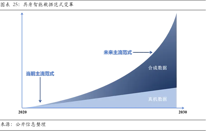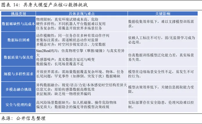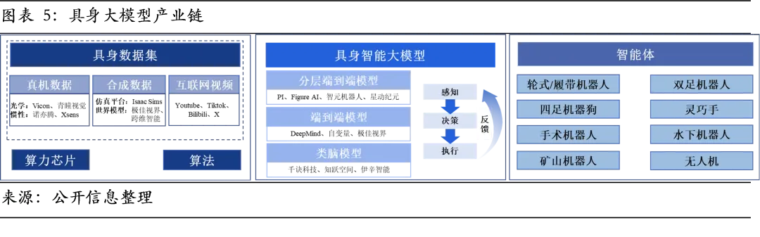 这一观点将产业瓶颈简化为数据规模问题,未能触及“数据-模型”范式错配这一根本性挑战。具身智能本质是学习物理世界中的动态因果规律,其训练数据需包含环境感知、物理交互、运动控制、任务执行等多源异构信息。而现有数据形态普遍是静态图像与视频,本质是对世界的被动观察,缺乏本体自身动作引发的反馈信息。盲目增加此类数据规模,非但无法提升模型性能,反而可能强化错误的统计关联,压制因果推理能力的发展。突破的关键在于高质量物理交互数据,这些数据不存在现成来源,需要专门采集或合成。因此,突破数据采集与生成瓶颈、构建高效的数据基础设施将成为产业链中具极高战略价值和投资潜力的关键节点。具身智能产业的真实图景是软硬件“双向约束、动态适配”的共生演进。硬件为算法能力设定了物理边界,如灵巧手自由度决定算法所规划的抓取姿态的丰富程度。而卓越的算法能够挖掘并释放硬件的潜能。例如,根据东京都市大学研究,通过预测控制与误差补偿算法,一只二指机械手执行不规则形状物体的抓取和移动成功率可从基础水平的63%提升至93%。更为关键的是,软件的前沿需求会反推硬件创新。当算法需要毫秒级的多模态传感器数据融合时,传统通用计算架构成为瓶颈,从而催生将感知、决策与控制计算集成的机器人专用芯片。因此,具身智能产业既非由硬件单向决定,也非软件独立定义,而是躯体与大脑在相互约束与牵引中协同演化的结果。这种深度协同关系决定单纯押注硬件或软件都难以构建长期壁垒,而具备软硬一体化设计能力、能在特定场景中实现快速闭环的团队更有可能在产业初期脱颖而出。具身大模型产业的核心价值链条紧密围绕数据生产、模型训练与智能体适配三个关键环节展开。上游数据基础设施决定模型训练的效能与成本,中游模型架构定义智能的核心形态,而下游智能体则最终承载并验证其商业价值。理解这一链条的内在逻辑与瓶颈是识别投资机会的关键。高质量、规模化数据的供给是驱动具身大模型部署的首要前提。当前产业普遍采用真机数据、仿真数据与互联网视频数据相结合的混合范式,以在成本、精度与场景适配性之间寻求最优解,三类数据构成了差异化且互补的供给体系。互联网视频数据是最容易大规模获取的数据形式,通常是从公开网络爬取的海量现实世界动态影像,涵盖人类日常活动、物体交互等丰富场景。其核心价值在于以极低成本为模型注入丰富的场景先验知识与常识理解,例如物体的常见空间位置、社会性交互习惯等规律。然而,其本质是被动观测数据,缺失动作与环境反馈间的因果关联,且高质量标注成本高昂(人工标注动作意图、物体关系、力反馈推测等信息),因此主要作为增强模型对世界认知的补充预训练材料。仿真数据质量较高且成本较低,具备高性价比。仿真数据是在高保真虚拟环境中,通过渲染虚拟场景并生成和控制虚拟机器人执行任务而采集的交互数据。其优势在于规模化能力与生成效率,无需实体硬件即可不间断地生成海量、多样且标注完善的交互序列,并能灵活切换光照、布局乃至物理参数以覆盖现实世界中难以采集的长尾与极端场景,从而扩展数据多样性。然而,其根本挑战在于虚实差距(Sim2Real Gap),即仿真物理引擎难以完全模拟现实世界的摩擦、形变、材料特性等非线性因素,导致在虚拟环境训练的模型迁移至真实世界时,性能往往出现衰减。相关测试显示,纯仿真训练机器人的操作误差会随任务复杂度提升而呈指数级放大,当涉及5步以上连续操作时,成功率骤降至20%以下。因此,仿真数据本质上是实现快速冷启动的预训练和强化学习工具,无法单独完成模型能力的最终闭环。仿真数据依赖于仿真平台进行数据增强和扩展。当前仿真平台已超越单一工具范畴,演变为整合场景生成(Gen)与物理模拟(Sim)的完整技术栈。模拟层致力于实现高保真的物理模拟与图形渲染。以英伟达Isaac Sim、Facebook Habitat为代表的平台能够支持从双足人形到多轴机械臂等多种形态的物理模拟,并具备高精度物理效果、逼真渲染与多传感器模拟。核心瓶颈在于虚拟场景的自动化生成,即如何利用AIGC生成合理且多样化的虚拟场景,以突破数据多样性的限制。具备强大模拟与生成能力的仿真平台,正成为加速产业数据迭代的核心枢纽,是支撑具身大模型研发的综合性基础设施。真机数据是具身大模型从虚拟训练通向现实部署不可替代的校准依据,由真人穿戴动捕设备,通过遥操作控制实体机器人,精准捕捉在真实世界中的动作轨迹数据。此类数据通常包括两类:一是环境感知数据,通过RGB摄像头、激光雷达、力触觉传感器等获取外部场景与对象的静态及动态多模态信息,构成理解复杂环境的基础;二是本体数据,涵盖关节运动、本体姿态、电机扭矩、交互力等反映自身状态与动力学特性的参数,是实现精准控制与模型优化的核心。其核心价值在于提供仿真环境无法精确复现的真实物理误差信号,数据流天然构成“感知-决策-执行-反馈”物理因果闭环,使得基于此训练的模型能够直接适配真实环境,有效规避Sim2Real Gap难题。然而,真机数据面临成本、规模与通用性三重核心瓶颈。首先,采集和标注成本极为高昂,不仅需要投入昂贵的机器人本体与动捕采集设备,更涉及巨大的人力与时