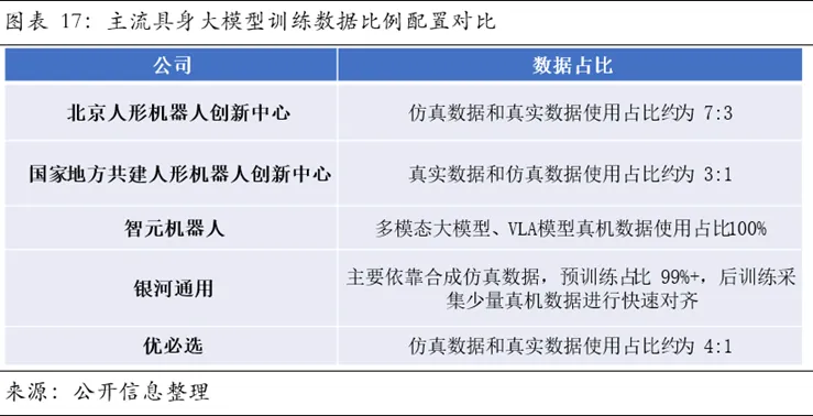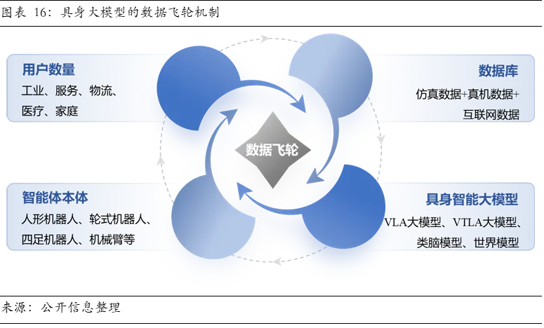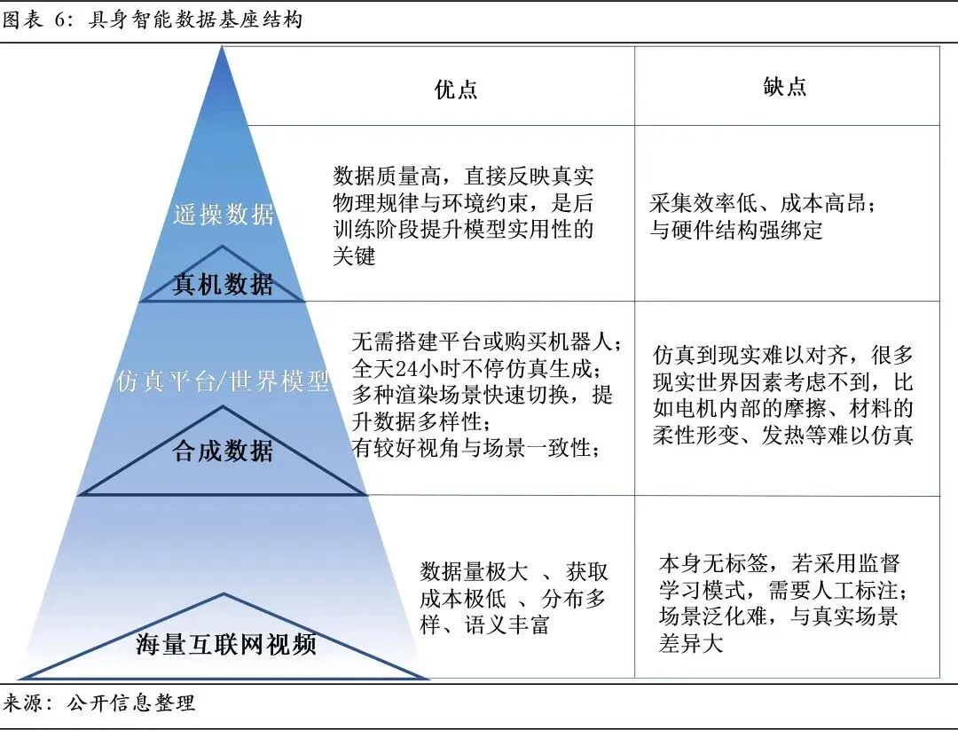 2、数据飞轮构筑核心壁垒,混合范式成为破局关键。产业突破遵循数据驱动的Scaling Law,但物理交互数据稀缺且获取成本高昂。突破依赖于构建“仿真预训练+真机校准+视频先验”的混合范式,以及支撑该范式的高保真仿真平台与高效动捕系统等基础设施。