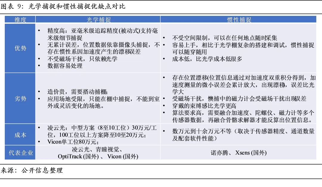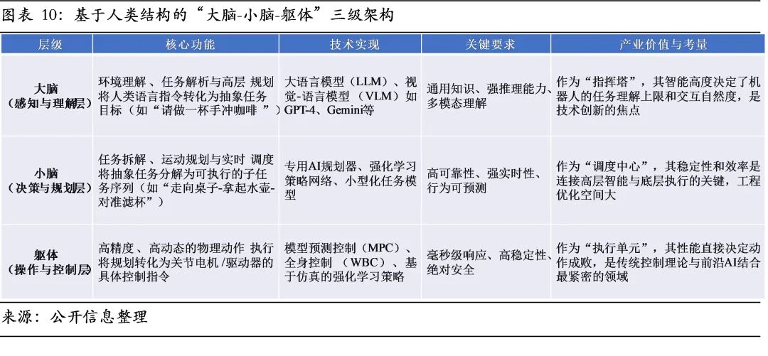 光学和惯性各有侧重,适配不同采集场景。光学动捕是精度最高的采集方案,无累积误差、抗干扰能力强,适合高精度建模场景。其劣势在于必须搭建专用的动捕棚,且受限于相机视场,易因标记点被遮挡导致数据中断。与之相比,惯性动捕的优势在于部署的灵活性,无需搭建动捕棚,不受环境光线与空间限制,便携性强,适用于户外及移动采集场景;主要缺陷在于传感器存在数据漂移,长时间运行的累积误差会影响定位精度,且易受金属磁场环境干扰。成本方面,光学系统的设备与场地成本高昂,单工位投入较高,国内方案约10-30万元,海外高端产品价格可达其3-4倍;惯性方案成本弹性大,价格区间从数万元到十余万元不等,取决于传感器精度、通道数量及配套软件性能,典型产品如诺亦腾PN3 Pro,售价约为4.58万元。因此,高精度建模与校准多选用光学动捕,而对灵活性要求高、精度需求中等的场景,惯性动捕则成为更具性价比的选择。具身大模型是衔接硬件与场景的智能中枢,其核心任务是将原始感知数据转化为精准的物理动作。一个根本性思路是借鉴人类的“大脑-小脑-躯体”架构作为设计蓝图。- 大脑(认知层)是指挥中枢,通常由GPT-4o为代表的VLM大模型担当,负责解读人类指令并解析为明确目标。这一层决定了智能上限和交互自然度。