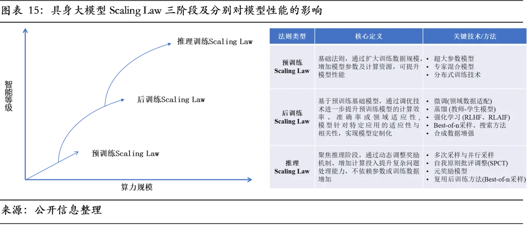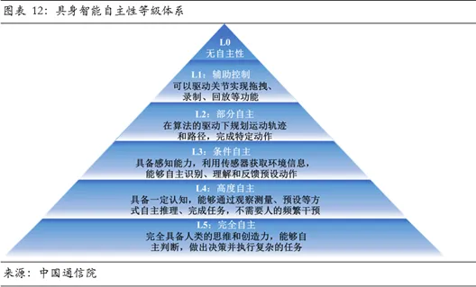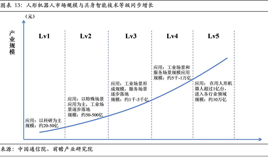 基于这一核心框架的不同实现方式,产业内主要演化出三条技术路径:分层模型是当前工程落地的主流选择。它严格遵循“大脑-小脑-躯体”的界限,采用异构技术栈组合。采用参数庞大、智能卓越但推理较慢的大模型担任大脑,用轻量、快速的专用技术作为小脑和躯体,从而在系统层面平衡智能与效能。例如,Figure 01采用GPT-4o作为大脑,小脑和躯体则采用自研的高速响应系统。这种路径的优势在于模块解耦,各层级可独立优化与升级,并能充分利用现有成熟的专用模型,且行为可解释性高。其挑战在于模块间接口设计复杂,可能产生信息损耗。端到端模型是头部厂商重点攻坚的前沿方向,旨在用单一模型实现从感知到动作的映射,省略中间的任务分解和规划步骤,最大化减少信息损失。端到端理论上能通过数据驱动达到全局最优,实现终极的任务泛化能力。谷歌RT-2模型和自变量WALL-A是典型代表。然而,该路径高度依赖大规模、高质量、多场景的动作数据集,且模型行为如同“黑箱”难以验证和控制,在复杂动态环境中的安全性保障是一大挑战。类脑模型是一条旨在颠覆底层传统计算范式的长期路径。它不追求用庞大的数据驱动性能,而是借鉴生物神经系统原理,采用脉冲神经网络等模型,构建动态推理引擎,追求在超低功耗下实现高鲁棒性的实时反应与自适应学习。该路径的优势在于理论上的超高能效比和应对不确定性的本能式反应能力,适合对功耗和延迟要求严苛的复杂动态环境。但其工程化与算法生态尚不成熟,训练难度大,在高阶认知任务上能力较弱,因此被视为一项重要的远期技术储备。具身智能的最终价值通过物理形态多样化的智能体得以实现和验证。当前智能体形态高度多元化,涵盖人形、轮式、四足、灵巧手及特种机器人等。这背后并非简单的硬件差异,而是截然不同的运动学结构、动力学模型与环境交互范式,对模型的跨平台泛化能力构成了根本性挑战。因此,产业的核心命题在于构建能够高效适配千差万别躯体的通用大模型,而非仅为特定形态训练的专用模型。这一挑战推动产业向“软硬件解耦”的生态模式演进。其核心不仅依赖于模型架构本身的进步,更在于构建标准化的硬件抽象层与机器人中间件,将具体硬件差异封装为统一的控制接口。唯有如此,具身大模型才能跨越硬件平台进行迁移与部署,真正释放其规模化应用的潜力。具身智能产业遵循一套被广泛引用的自主性等级体系(L0-L5),用以标定技术发展阶段与商业化前景。产业当前正处于L1(辅助控制)向L2(具备感知的条件自主)突破的关键爬坡期,核心挑战从在特定环境下完成单一预设动作,转向在开放环境实现复杂任务可靠执行与泛化,例如在陌生环境中完成一连串识别、抓取、操作和归位的组合任务。准确率是衡量跨越能力等级的核心量化标尺。判断大模型技术是否达到某一等级依靠其在对应任务复杂度下的长期成功率。例如,Physical Intelligence的π0.5模型在家庭真实环境的长程任务中实现超过60%的准确率,标志其能力正从L1的单一特定任务执行,向L2的多任务自主规划迈进,印证数据与算法驱动下自主能力正在发生质变。人形机器人的市场空间与具身大模型的技术等级呈现同步放大关系。根据预测,当具身智能于2028年左右达到L2级时,本体市场将在特定场景初步打开,市场规模约为数十亿元;随着技术向L3(场景泛化)、L4(有限范围通用)迈进,工业与服务场景将实现规模化落地,推动市场规模在2035-2045年间跃升至千亿乃至万亿元级别;面向L5(完全通用自主)的远期未来,人形机器人有望成为基础生产力工具,催生出一个十万亿级的庞大产业。因此,具身大模型在基础能力上的每一次突破都在为未来释放巨大的商业价值。具身大模型的突破遵循以数据为核心的发展定律。当前L1级模型已需超1万小时的数据支撑训练。根据清华大学相关测算,要达到人眼级别的三维感知能力并理解上千类物体,则需构建10亿量级的数据集。与传统大模型直接利用现成的海量图文数据不同,具身大模型面临根本性数据稀缺。其性能跃迁不仅取决于数据规模,更取决于能否为不同训练阶段持续供给结构匹配、质量达标的混合数据。当前交互数据从数据采集、标注、仿真保真度等环节均存在瓶颈,且受成本与安全伦理等多重约束。因此,构建一套与模型能力动态耦合的数据供给体系成为提升数据效能的关键。数据效能需通过Scaling Law三阶段的差异化策略精准释放。随着AI技术的发展,计算资源与模型性能的关系在预训练、后训练(微调)和推理三个阶段已分化出不同的法则,这直接映射成截然不同的数据需求。在预训练阶段,目标是建立基础动作技能与泛化能力,其性能与数据规模强相关。此阶段需消耗海量、多样但成本可控的仿真数据,并辅以互联网视频数据注入先验常识。进入微调阶段,目标是将通用能力对齐到具体物理规则与任务,性能提升依赖数据质量。此时,高精度、小批量、富含真实物理反馈的真机数据成为关键,用于修正仿真偏差,实现虚实校准。在推理部署阶段,模型在真实环境中运行产生的在线交互数据(尤其是失败案例)则成为持续优化与安全迭代的新燃料,既可反哺仿真参数优化,又可作为新一轮微调的数据源。三个阶段构成驱动模型能力自我强化的数据飞轮。驱动数据飞轮高效运转的核心是“