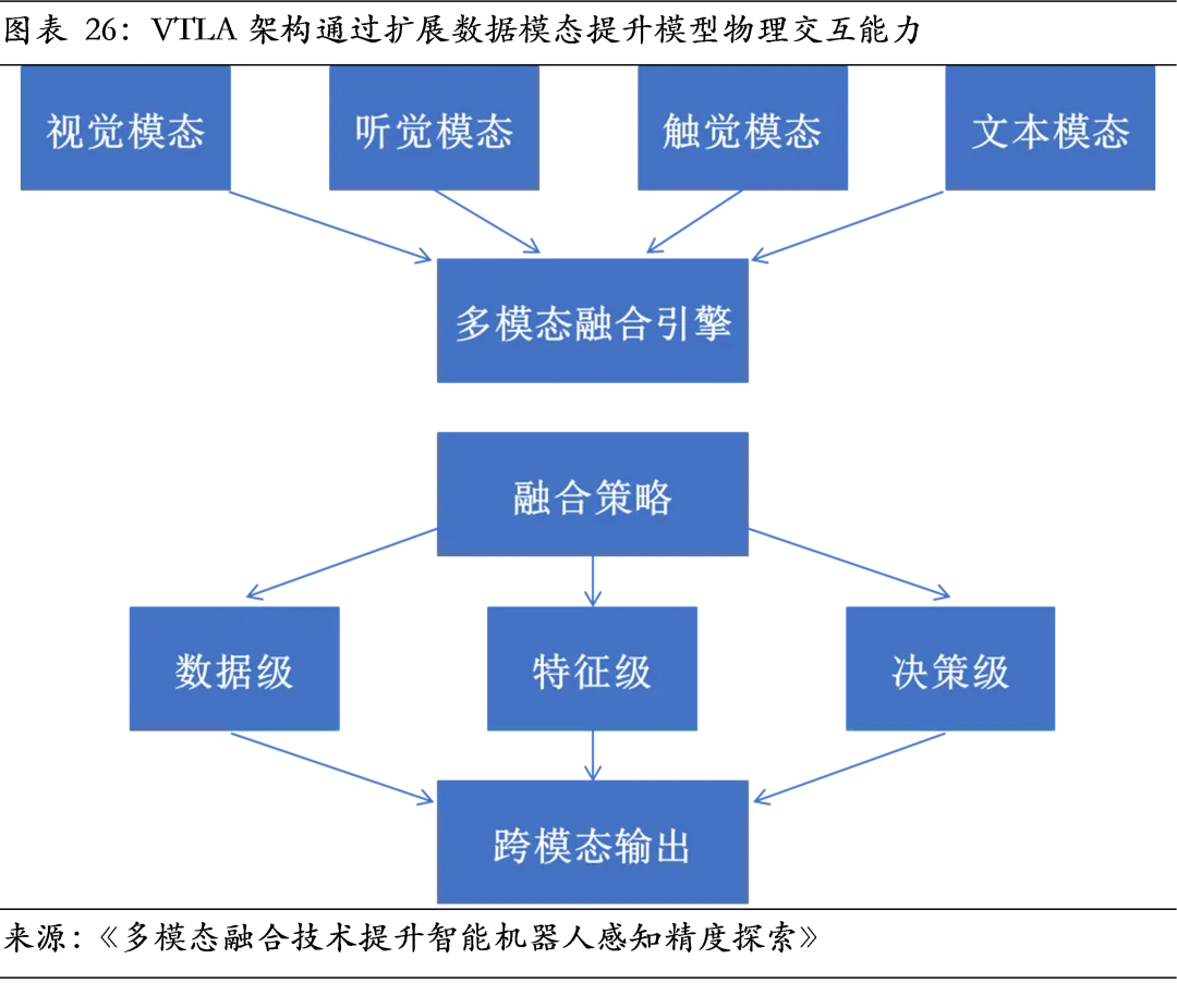 此外,数据模态的持续扩展是提升模型物理交互能力的必然方向。当前VLA模型覆盖视、听、动三大模态,但距离类人的灵巧操作,仍缺失关键的触觉、力觉等物理反馈信息。以VTLA为例的前沿研究表明,触觉信息能显著提升模型对物体滑移、质地等属性的判断,是实现柔性抓取与精细操作的核心。因此,多模态融合能力正成为定义模型性能上限的关键,并催生对传感器与融合算法的需求。