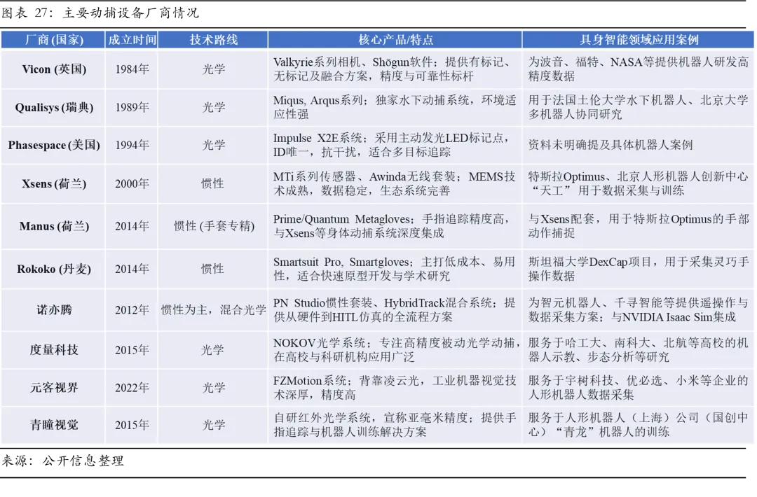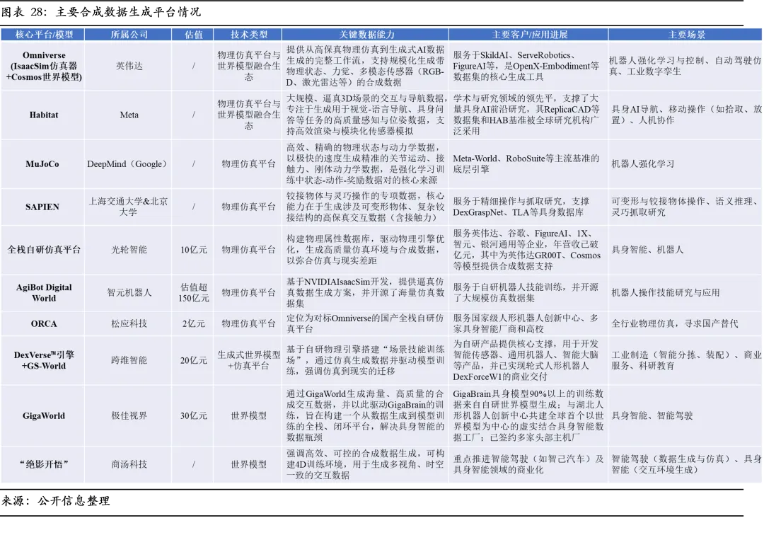通用具身智能的最终形态并非单一模型,而是一个复杂协同的异构系统。单纯依赖任何一种模型架构均会遇到瓶颈,未来架构将走向“认知端到端+内部模拟+控制高效化”深度融合架构。具体而言,系统顶层采用VLA等多模态模型负责高层指令理解与任务规划;世界模型作为内部数字孪生模拟器,为每一步决策提供基于物理仿真的动态推演;而在底层控制层面则可能引入高能效的类脑模型处理实时控制,以实现毫秒级、高能效的本能反应。该融合架构的本质是让思考、推理与反射三种能力在同一个系统内高效协同。它既非简单的模块拼接,也非追求一个全能的单一模型,而是通过精心设计的架构,让不同类型的模型在最适合的环节发挥优势,并通过世界模型这一内部模拟和推演平台实现信息交换与一致性校验。因此,产业的竞争正从拥有最佳单点模型的算法竞赛,转向定义并实现整个复杂异构系统架构的工程能力比拼。这不仅是技术挑战,更是定义未来产业格局的核心壁垒。面对技术挑战与商业现实,企业路径分化。绝大多数企业选择聚焦垂直场景,以实现快速商业闭环为核心目标,其本质是以世界模型为基座,构建场景数据闭环。受限于场景复杂度、技术鲁棒性及投资回报周期的约束,垂直深耕高端制造、仓储物流、特种作业(如水下巡检)等高价值场景成为最优解。此类企业的核心壁垒并非追求扩大模型参数规模,而在于构建“感知-预测-推理-决策-执行-反馈”闭环,形成针对特定场景的Know-How,最终实现商业落地与模型效能相互强化的正反馈循环。他们构成产业初期规模化落地的主力军,其价值侧重于可验证的场景渗透与数据闭环能力。少数具备全栈技术与雄厚生态资源的领军者则致力于打造适配多种本体型态、理解多样任务的通用基础模型与开放生态。其竞争维度已扩展至数据生态、开发者社区以及产业链联盟,旨在掌握产业底层的生态控制权。这两条路径并非完全割裂,成功实现垂直场景闭环的企业,其积累的专用数据与工程经验将成为其向上延伸的重要筹码;而通用平台的演进将为垂直应用提供更强大的基础能力。整体来看,产业机遇锚定于三大价值环节:构建融合世界模型的认知引擎、提供高效数据生产的基础设施、在垂直场景实现数据闭环与商业破局。三条主线共同构成驱动具身智能从技术突破走向规模商业化的核心引擎。当前具身智能产业的竞争已演变为贯穿“数据—模型—本体”的全链条闭环能力比拼。在数据稀缺和技术融合的驱动下,不同类型的玩家依据各自禀赋,选择差异化的路径,形成分层竞争、生态合作的复杂格局。此环节的竞争正从单一工具的性能比拼升级为覆盖数据生产全流程的平台化能力较量。在真机数据采集中,竞争集中在高精度动捕设备,呈现国际品牌Vicon、OptiTrack主导高端市场,主要服务于影视制作和科研机构。国内厂商提供的系统在精度上通常略低于海外厂商,但具有成本优势。以青瞳视觉为代表的国内厂商正以双轨战略破局,其“鲲鹏”系列冲击0.02mm的超高精度市场,而“普罗米修斯”等万元级方案满足更广泛的商业化需求。合成数据环节的竞争分化为两大技术路径:基于物理规则的高保真仿真平台与基于学习的生成式世界模型。前者追求对物理规律的精确模拟,后者则强调自动化生成与场景想象力。在该领域,英伟达凭借其Omniverse平台(整合Isaac Sim仿真+Cosmos世界模型),构建了从GPU、物理引擎到开发工具的完整生态。国内厂商则多点突围,以光轮智能、智元机器人、松应科技为代表,深耕物理仿真平台,致力于打造国产化高精度仿真工具,缩小虚实差距。极佳视界、商汤科技、北京智源研究院等则卡位世界模型新赛道,已在具身智能、自动驾驶等领域建立早期客户案例,进入商业化落地阶段。得益于数据基础设施的持续赋能,产业已能够构建如OpenX-Embodiment、AgiBot World等高质量的超大规模数据集。这些数据集普遍采用“仿真预训练+真机校准”的混合模式,既借助真实数据确保物理规律对齐,又利用合成数据高效扩展规模、覆盖长尾场景,从而提炼出跨平台的通用技能。模型层是产业价值凝聚的核心。从技术演进来看,“VLA+世界模型”成为主流架构方向,旨在为机器人赋予物理常识与长程规划能力,以突破复杂任务的泛化瓶颈。在商业路径方面,具身大模型企业普遍将软硬一体化作为核心战略。通过自研模型与本体的深度协同,在工业制造、仓储物流等场景中率先实现复杂长程任务的成功率与稳定性突破,并以此构建场景数据闭环壁垒。因此,获取行业标杆客户的联合验证与项目落地是其实现商业闭环的关键里程碑。而英伟达、DeepMind、智元则专注于提供跨平台的基础模型或开发工具,其商业进展体现在开发者生态的构建与合作伙伴的数量。评估具身大模型厂商的核心能力及长期成长性需聚焦四个关键维度。首先,技术路径的核心在于模型架构的布局及其在长程规划、精细操作等关键任务的性能。其次,数据体系的效能取决于其采用的数据范式与构建数据飞轮的能力。此外,路线选择决定其发展边界,软硬一体化全栈公司需软硬件深度协同并相互反哺,纯模型供应商的关键则在于对异构硬件的适配性。最后,商业落地的深度与广度是衡量实际价值的最终标尺。这些维度共同构成企业从技术到市场的完整竞争力链