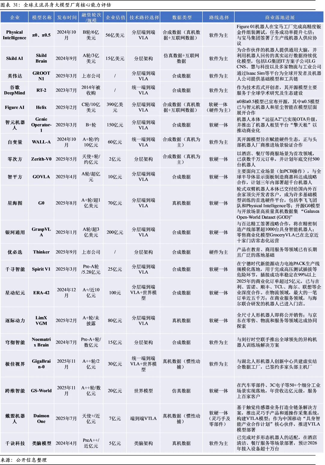 4、商业化路径分化,垂直场景闭环能力是当前阶段的确定性机会。在通用智能远期目标的指引下,产业呈现双重路径。绝大多数企业聚焦工业制造、特种作业等垂直场景,以软硬一体方式构建“数据-模型-本体”闭环,快速验证技术效用并实现商业回报,其壁垒在于场景Know-How与专属数据资产;少数领军者则致力于打造跨平台的基础模型与生态。前者是推动产业形成初期商业正循环的主力。