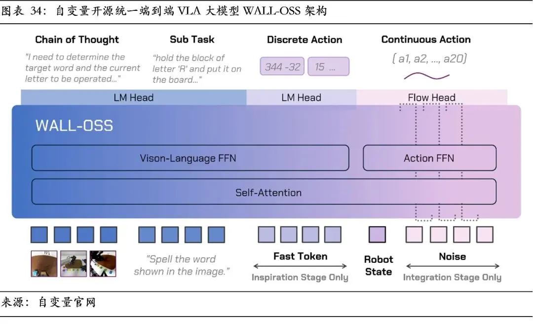 自变量机器人以其自主研发的统一端到端VLA模型WALL-A为核心,其采用单一Transformer架构实现从感知到控制的直接映射。该模型已开源为WALL-OSS,体现了公司对技术透明与生态协作的投入。其架构优势在于处理长序列、高动态的物理交互任务以及零样本泛化能力。