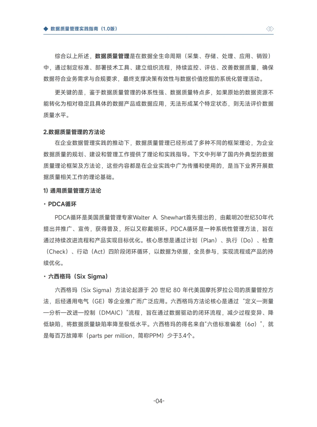 指南梳理了 PDCA 循环、六西格玛、TDQM 等国内外主流方法论,以及我国 GB/T 系列等多项数据质量专项标准。数据质量管理的核心价值体现在提升数据价值与业务效能、保障决策可靠、平衡共享与风险管控等方面,但实践中易陷入忽视业务导向、缺乏全流程管理等误区,还面临质量管控与业务优先级、存量与增量数据治理的冲突。