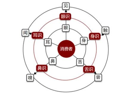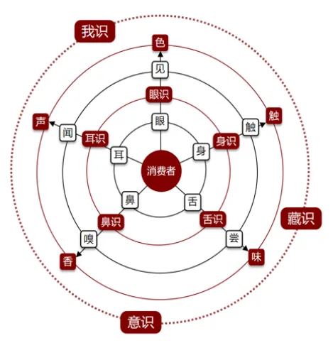 消费者通过“五感”接触了品牌的“五觉”(品牌方有关视觉、听觉、味觉、嗅觉、触觉的内容设计与品牌传播),形成“五识”,但并不仅仅停留在“五识”。而是自觉地整合来自五感的感受得到的认识,形成了对一个品牌的整体的认知与判断,并基于自身的学识、经历、经验等,从中体味到其超越于物理功能之外的其他社会性的、文化性的、象征性的含义。同时,考量该品牌与自己的关系,能够给自己带来什么、与自己的匹配度等等,形成“我识”。而“我识”的形成过程,与其“藏识”有着密切的关联。可以说,是“藏识”,决定了消费者对品牌的“意识”、“我识”的形成。