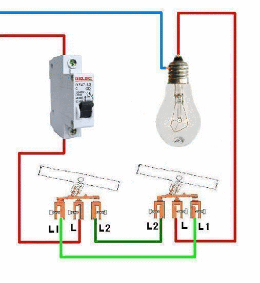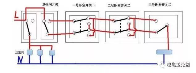 三个开关控制一个灯,就是在双控的基础上,把两个开关的连接线中间再加上一个双刀双掷开关。如果没有的话,可以用双开代替。