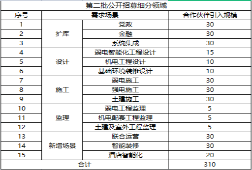 为补充第一批招募分行业合作伙伴的不足,本次招募将对党政、金融、系统集成三个行业进行扩库,每个行业扩库30家;新增集客项目设计、施工、监理及新增场景伙伴招募,总计共310家。具体数量如下: